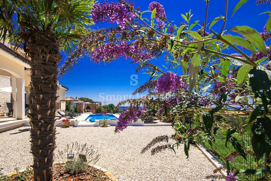 Raskošna vila s velikim bazenom, lijepo uređenom okućnicom i prekrasnim pogledom na more na mirnoj lokaciji 8 km udaljenoj od mora, te 11 km od centra Poreča ili Novigrada.
