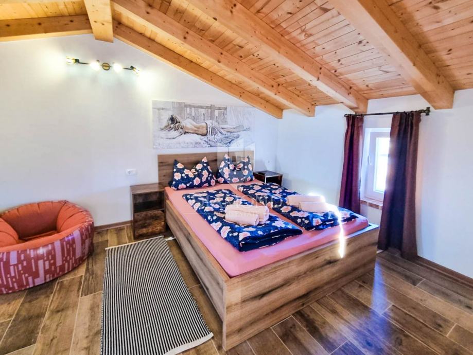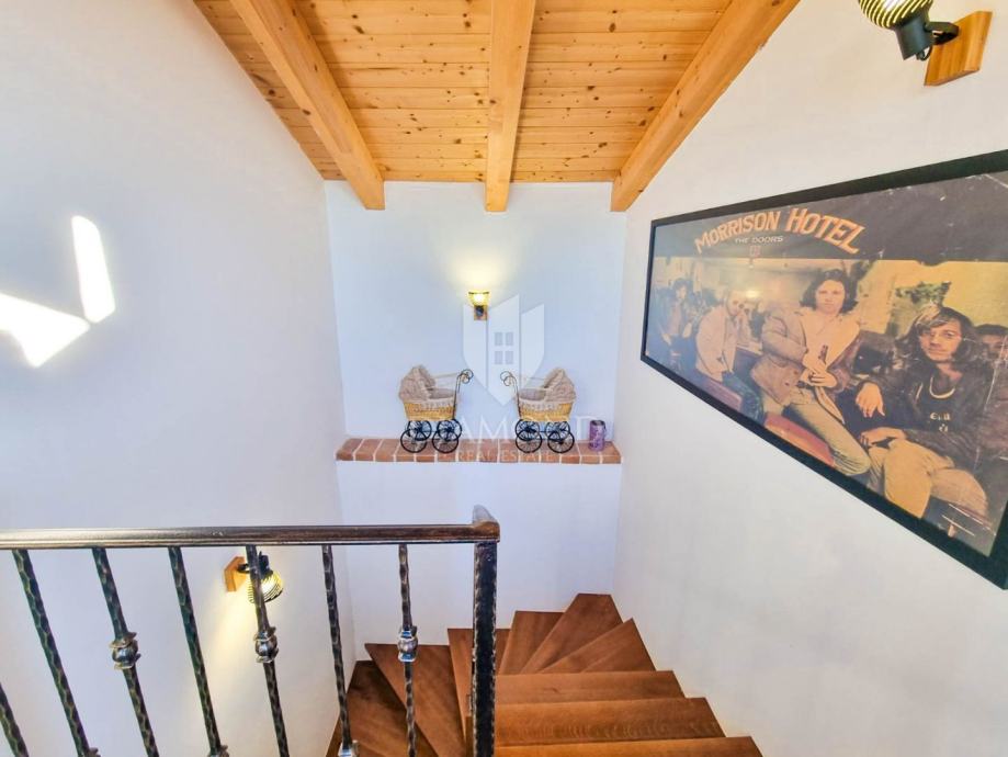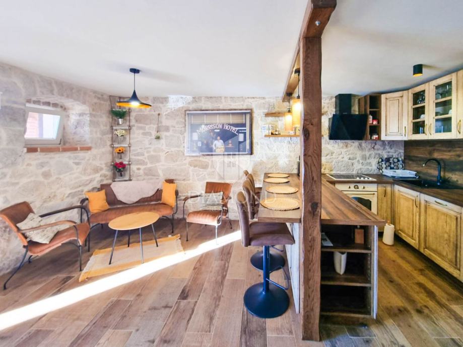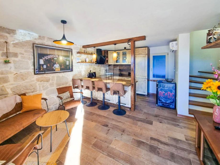 Ulazna vrata vode u prostran dnevni boravak, gdje se tradicionalni elementi poput kamenih zidova stapaju s modernim udobnostima. Dnevni boravak je prozračan i svijetao.