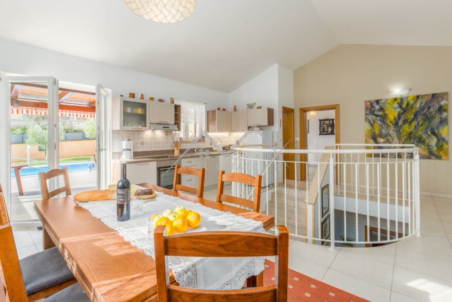 Na kat se dolazi velikim unutarnjim stepeništem koje je već pripremljeno za ugradnju lifta za osobe s invaliditetom. Na katu se nalazi dnevni boravak s kaminom koji je povezan s centralnim grijanjem, kuhinja s blagovaonicom, dvije spavaće sobe, svaka s vlastitom privatnom kupaonicom, te jedan mali WC. Iz dnevnog boravka izlazi se na zatvorenu terasu s koje se pruža prekrasan pogled na Motovun i okolne brežuljke. Iz kuhinje se izlazi na vanjsku terasu, odnosno sunčalište s bazenom koji je također prilagođen osobama s invaliditetom, te se tu nalazi i vanjski roštilj.
