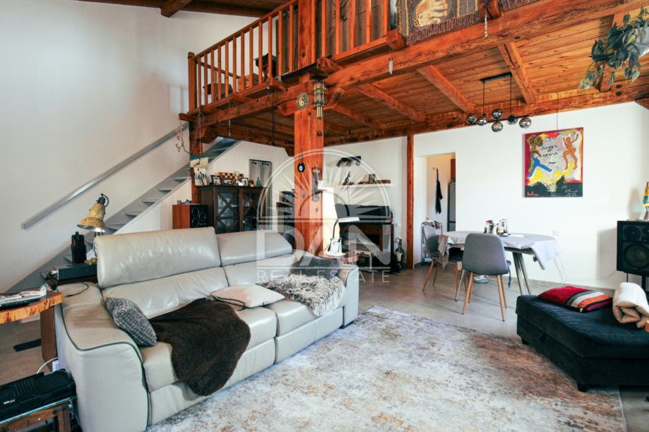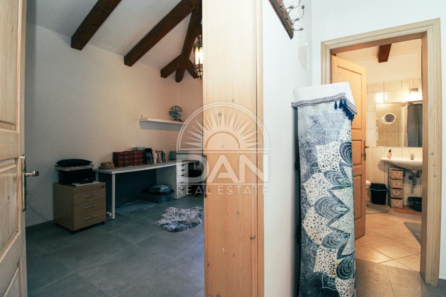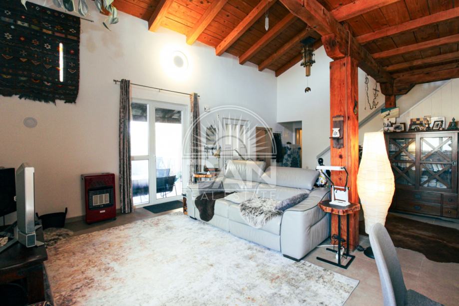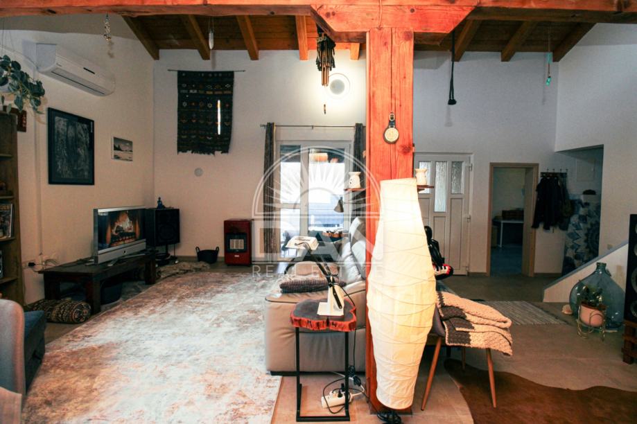 Interijer sastoji od prostranog dnevnog boravka i blagovaonice s visokim stropovima, drvenim gredama te kaminom na drva koji prostoru daje poseban karakter. Kuhinja je odvojena i potpuno opremljena. Kuća ima dvije spavaće sobe, obje s visokim stropovima i lijepo očuvanim detaljima originalne gradnje. Na međukatu se nalazi dodatna prostorija koja trenutno ima funkciju ureda.