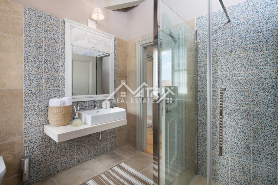 Ukupna stambena površina ove prekrasne vile je 359 m2, raspoređenih na dvije etaže - prizemlje i prvi kat. Centralni dio prizemlja je veliki prostor koji ujedinjuje blagovaonicu s stolom za najmanje 10 osoba, s potpuno opremljenom rustikalnom kuhinjom sa šankom. Također, u prizemlju se nalazi veliki dnevni boravak s kaminom, WC za goste i jedna prostrana spavaća soba s vlastitom kupaonicom. Sve prostorije imaju velike staklene stijene koje, uz obilje prirodnog svjetla, omogućuju i direktan izlaz u vrt i na terasu bazena.
