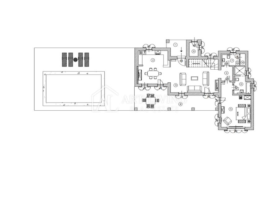 U uređenom i ograđenom dvorištu, nalazi se prekrasan bazen ukupne površine 32 m2 sa sunčalištem, kojem se pristupa sa natkrivene terase.