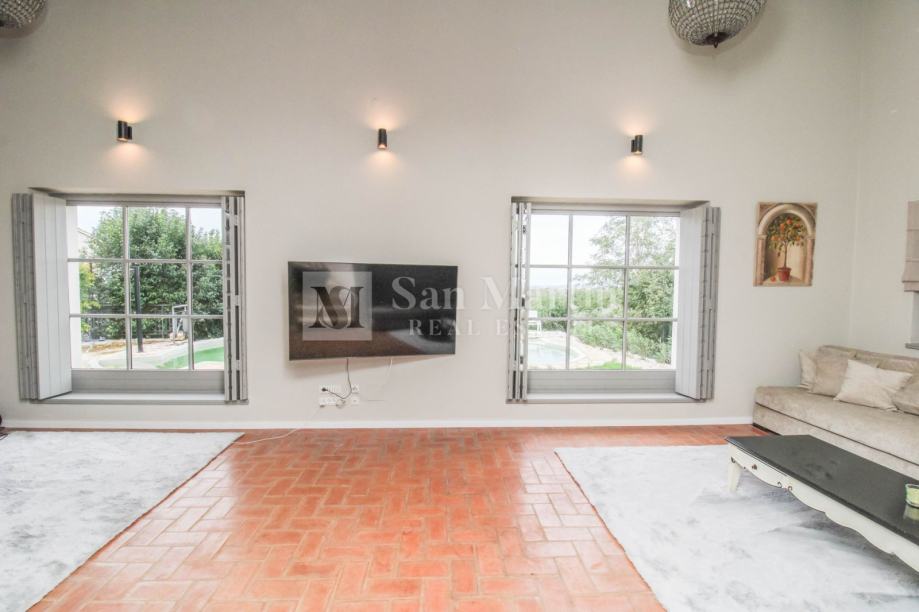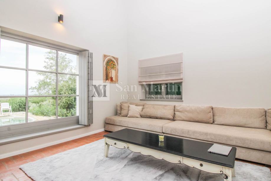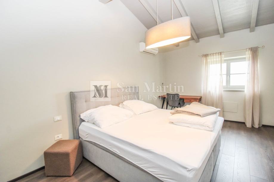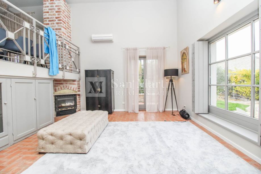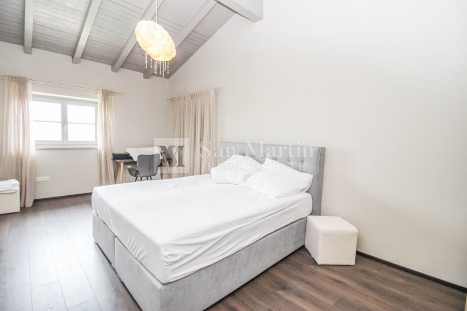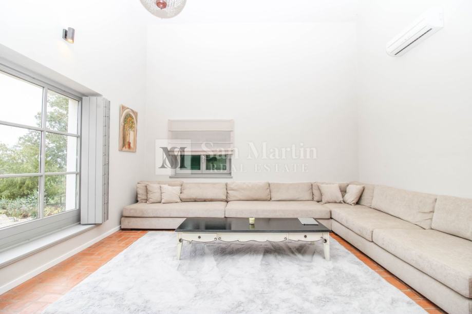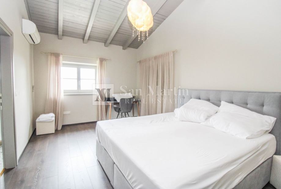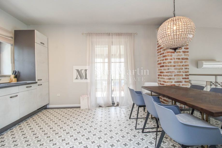 U prizemlju se smjestio veliki dnevni boravak sa izlazom u uređeni vrt u kojem se nalazi bazen sa zonom za sunčanje te u visokom prizemlju se nalazi kuhinja sa blagovaonom koja ima izlaz na natkrivenu terasu sa koje se pruža prekrasan pogled na prirodu i more. Na istom katu se smjestila i jedna spavaća soba sa vlastitom kupaonom. Na prvom katu su još četiri spavaće sobe i tri kupaone.