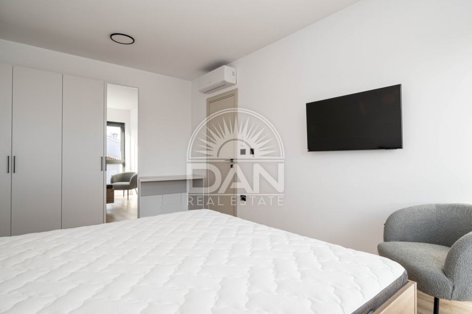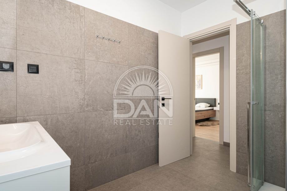 Nedaleko od Poreča, u modernoj zgradi, prodaje se stan površine 83 m². Koncept stana raspoređen je na dvije etaže: u prizemlju se nalaze dnevni boravak s kuhinjom i blagovaonom otvorenog tipa, toalet te ostava, dok se na katu nalaze dvije prostrane spavaće sobe i kupaonica.