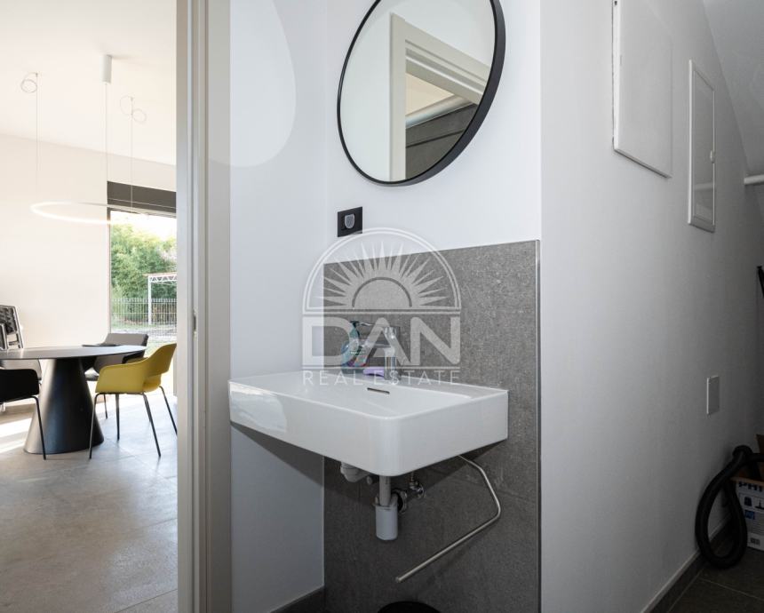 Iz dnevnog boravka izlazi se na popločanu terasu s bazenom i uređenom okućnicom, koja će biti ograđena živom ogradom kako bi se osigurala privatnost. Okolne zgrade nalaze se na udaljenosti, što daje dodatni osjećaj mira i intime.