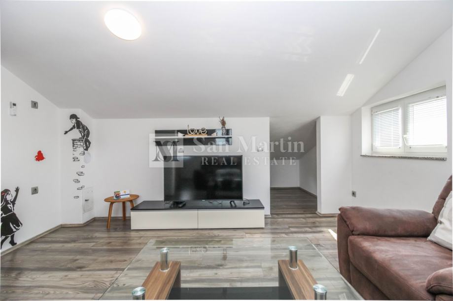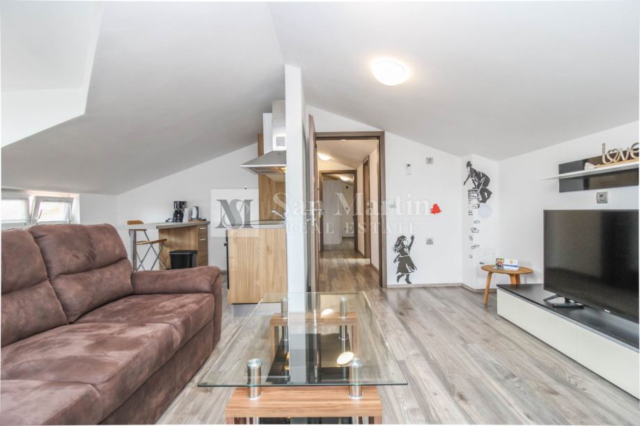 Iz dnevnog prostora stana pruža se pogled na more. Ukupna kvadratura nekretnine je 84 m2.