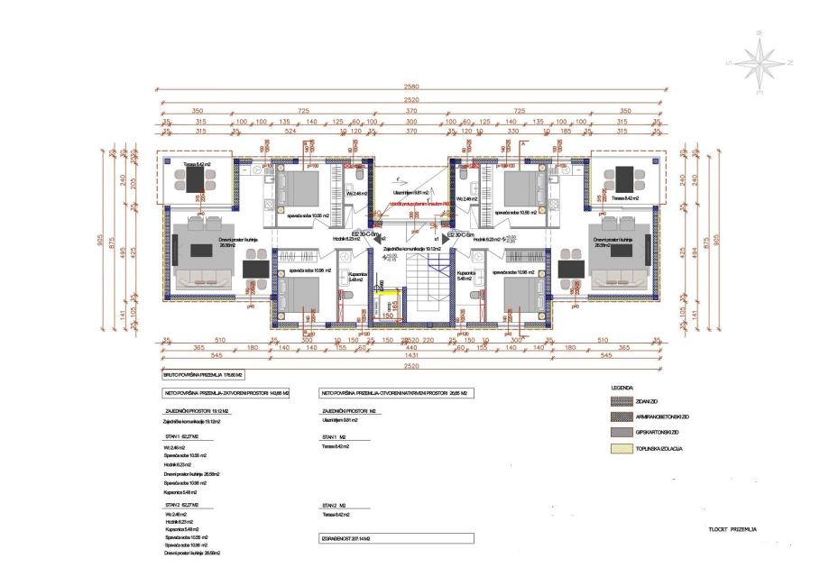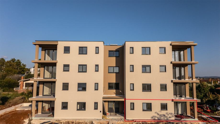 Prodaje se moderan stan u prizemlju stambene zgrade u izgradnji, ukupne stambene površine 62,27 m², sa dodatnom prostranom terasom od 8,42 m². Stan se sastoji od otvorenog dnevnog boravka sa kuhinjom i blagovaonom , dvije spavaće sobe, kupatila, dodatnog WC-a i terase.