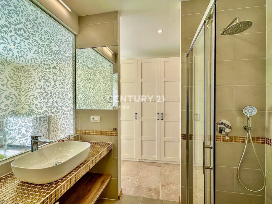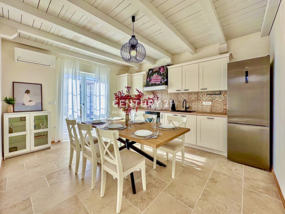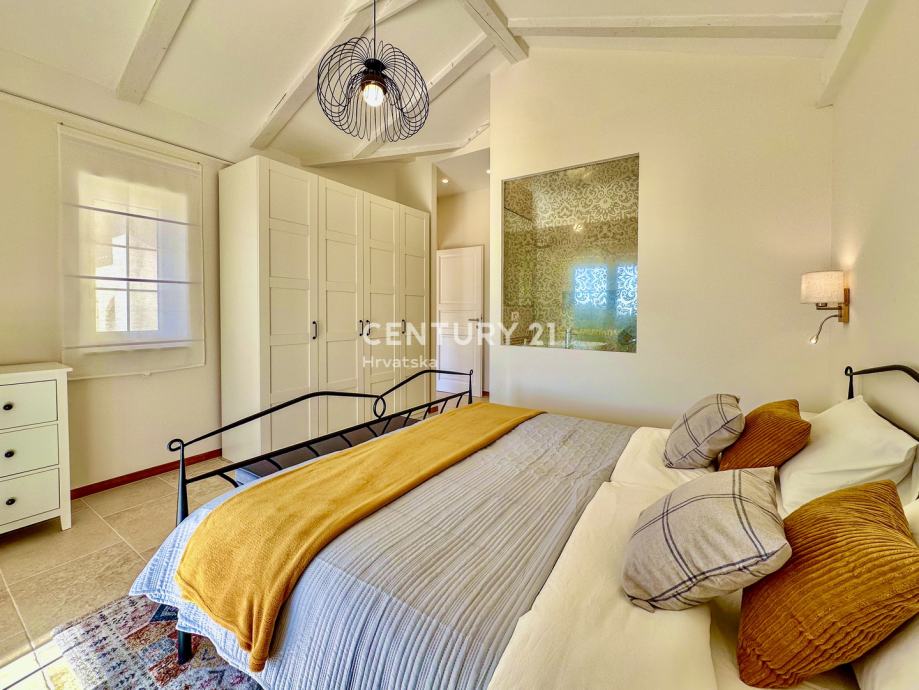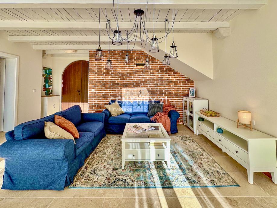 Kuća impresionira svojim jedinstvenim mediteranskim stilom, toplim materijalima i mnogim promišljenim detaljima koji joj daju poseban šarm. Pri ulasku odmah osjetite sklad kamena, drva, opeke i tradicionalnih elemenata poput starih crijepova, koji su korišteni kao ukras iznad novog krova.