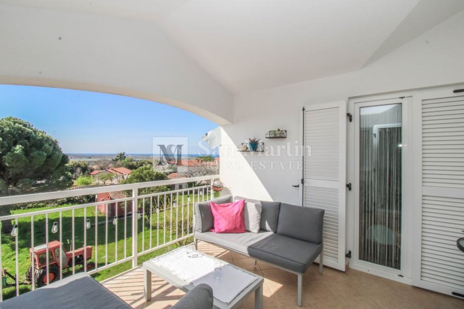 Dnevni prostor stana ima izlaz na natkrivenu terasu sa koje se pruža lijepi pogled na more i okolicu.