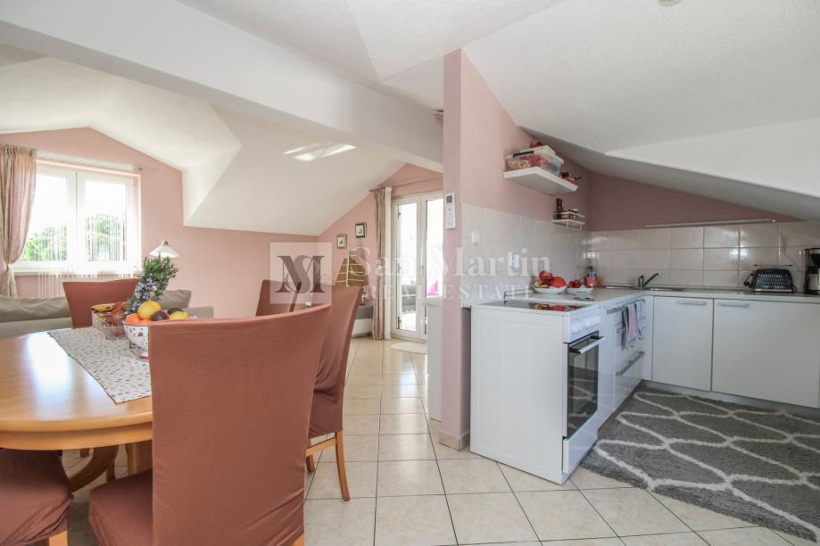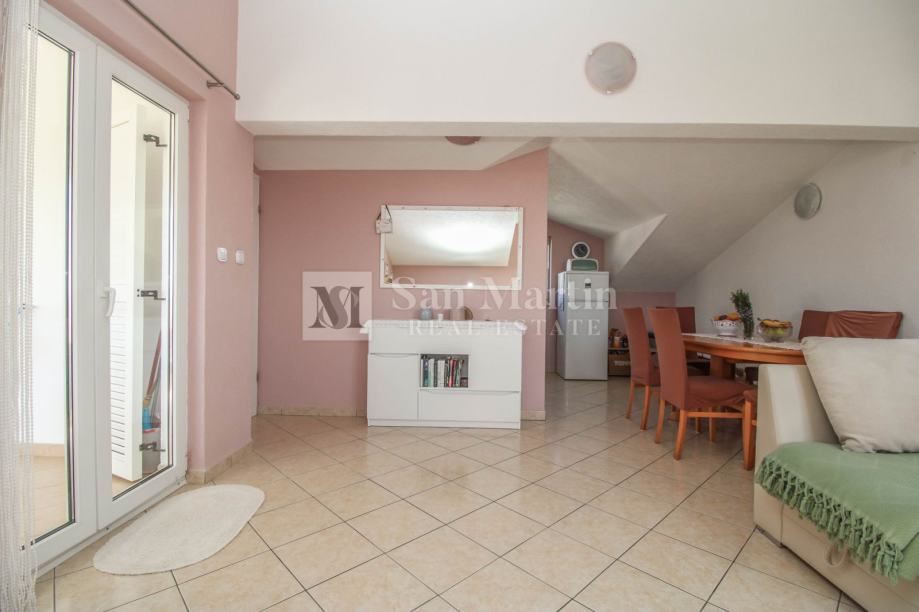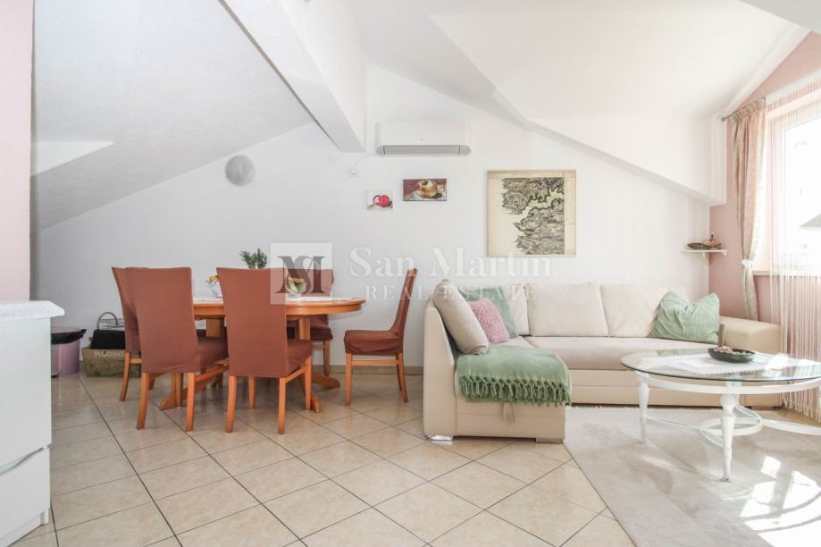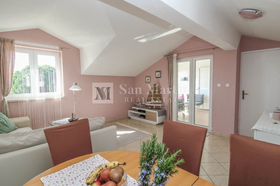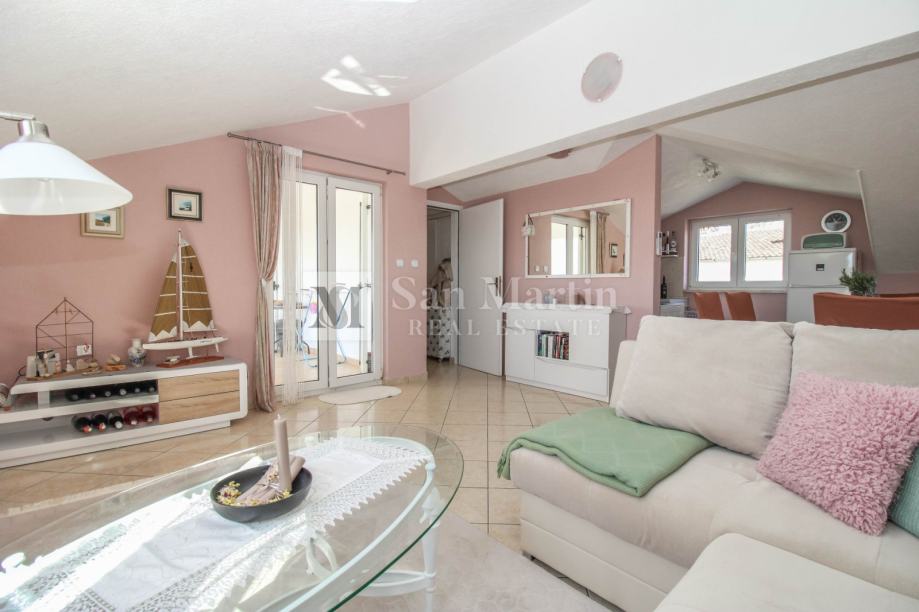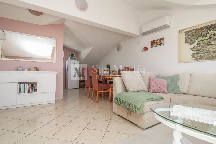 U blizini mora u potkrovlju manje stambene zgrade smjestio se ovaj simpatičan stan ukupne površine 71,17 m2. Nekretnina se sastoji od ulaznog hodnika, dnevnog boravka, kuhinje i blagovaone te 2 spavaće sobe.