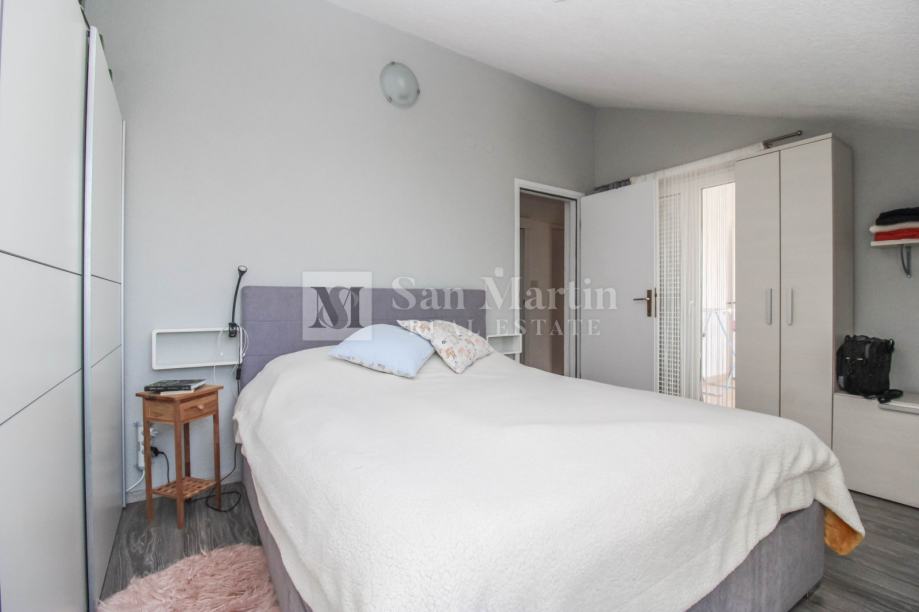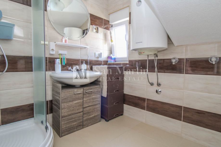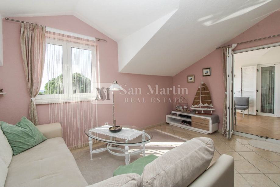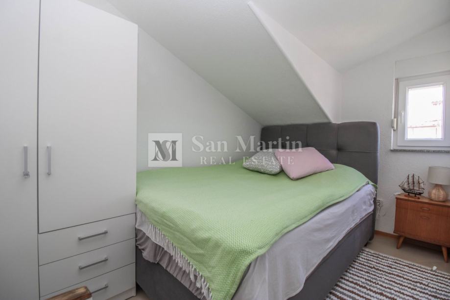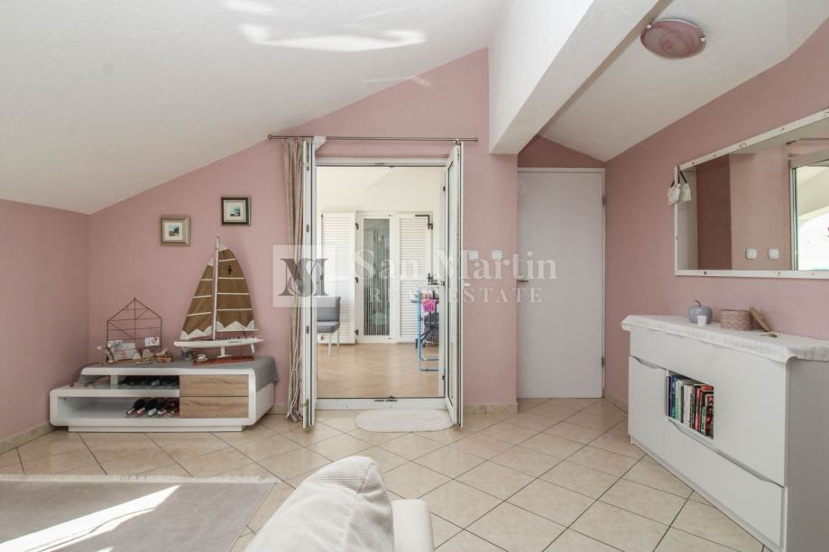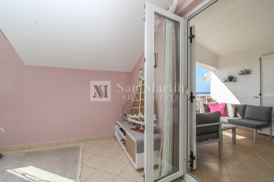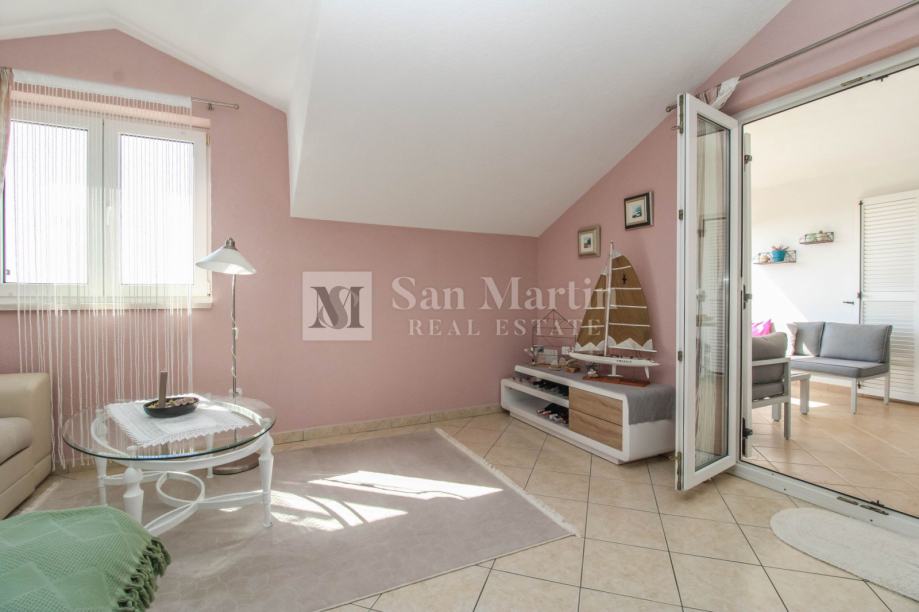 U blizini mora u potkrovlju manje stambene zgrade smjestio se ovaj simpatičan stan ukupne površine 71,17 m2. Nekretnina se sastoji od ulaznog hodnika, dnevnog boravka, kuhinje i blagovaone te 2 spavaće sobe.