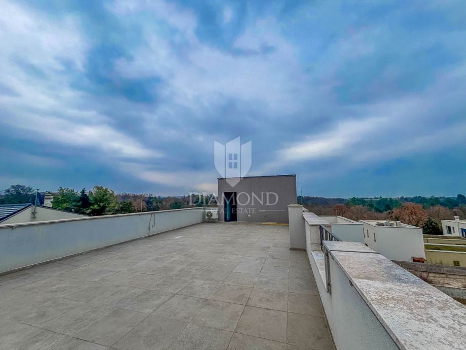 Posebnu vrijednost daje prostrana krovna terasa od 86 m² s pripremama za jacuzzi i ljetnu kuhinju (voda, struja, odvod), idealna za uživanje i druženja. Stan je opremljen podnim grijanjem u svim prostorijama te centralnim klima uređajem za hlađenje, što osigurava ugodnu temperaturu tijekom cijele godine.