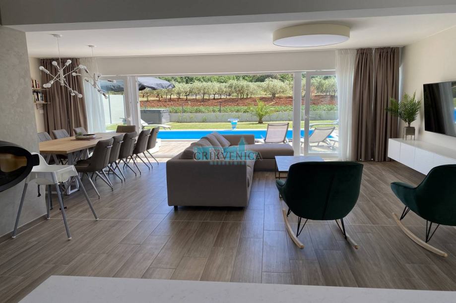 Prodajemo prekrasnu novogradnju sa šest spavaćih soba , četiri kupaonice ( 1 kada, 3 tuš kabine ), kuhinjom sa blagovaonicom za dvanaest osoba, velikim dnevnim boravkom. Kuća ima veliku okućnicu sa grijanim bazenom veličine 26,5 m2 sa slapom i masažnim pumpama, jacuzzi, sauna, dječje igralište, trampolin, roštilj....kuća se iznajmljuje u turističke svrhe i opremljena je sa svim potrebnim sadržajima, te se kao takva i prodaje. Grijanje/hlađenje na dizalice topline. Sve prostorije su klimatizirane. Kvalitetna gradnja i unutarnje uređenje, mirna lokacija idealna za savršeni odmor...