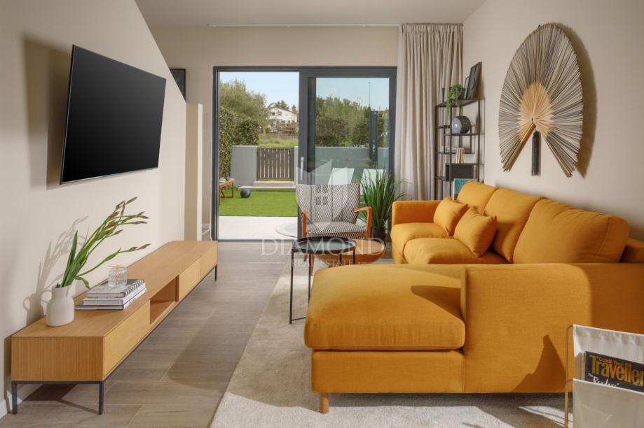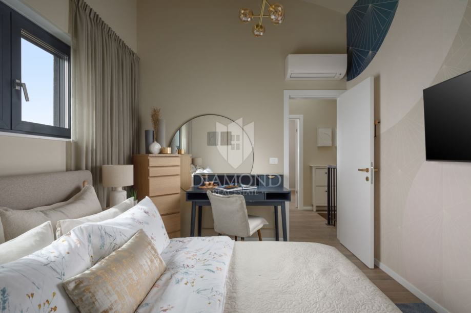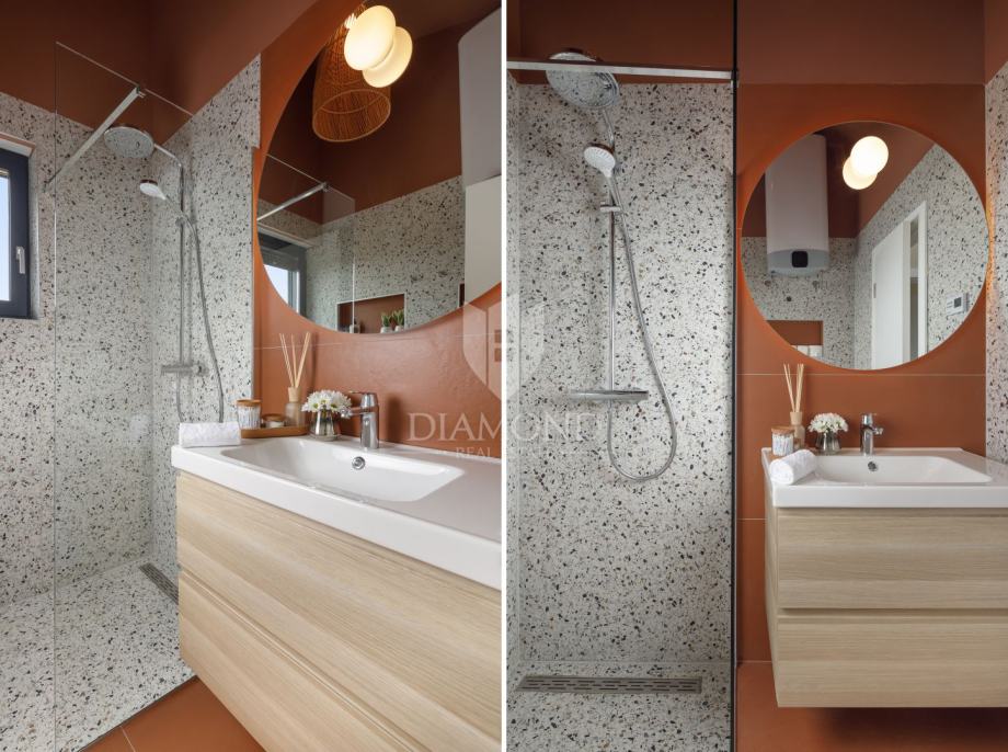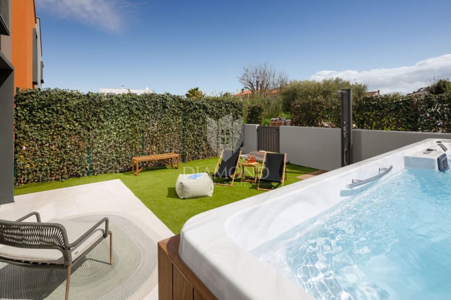 U prizemlju se nalazi prozračan dnevni prostor povezan s kuhinjom i blagovaonicom u otvorenom konceptu, a velike staklene stijene omogućuju obilje dnevnog svjetla i izravan izlaz na uređeno dvorište površine 100 m² u kojem se nalazi bazen – savršen za uživanje u toplim danima i opuštenim večerima. Na katu su smještene dvijenspavaće sobe i moderna kupaonica, s pažljivo odabranim materijalima i detaljima.