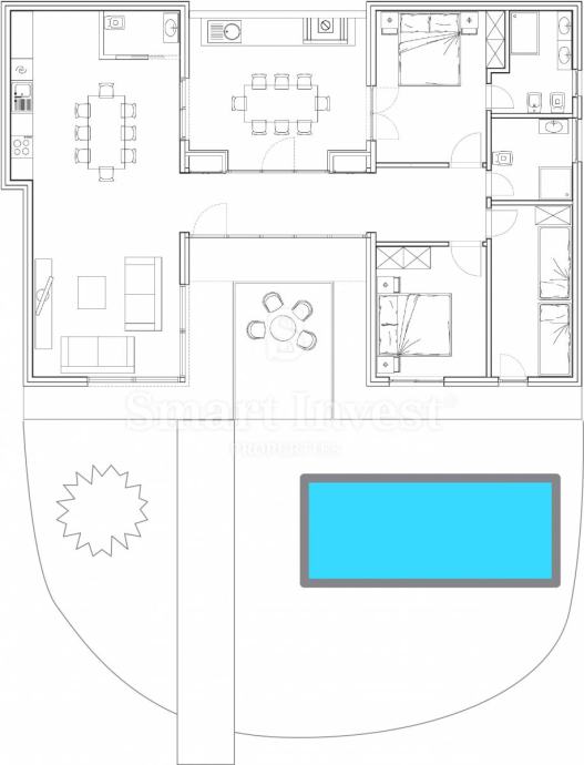 Spavaći dio se sastoji od tri spavaće sobe i dvije kupaonice dok se dnevni dio sastoji od open space prostora koji objedinjuje kuhinju, blagovaonicu i dnevni boravak te gostinjskog toaleta.