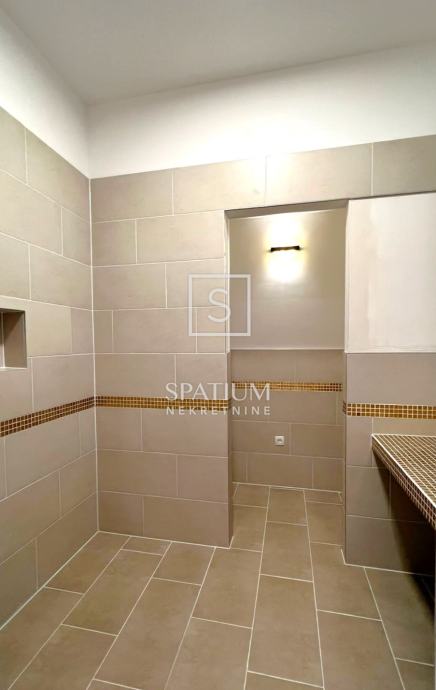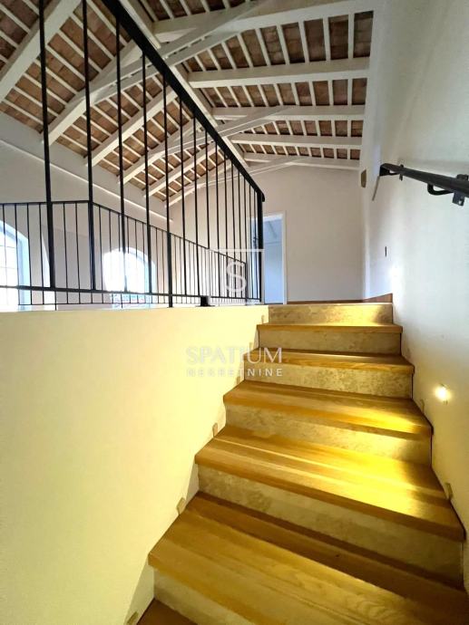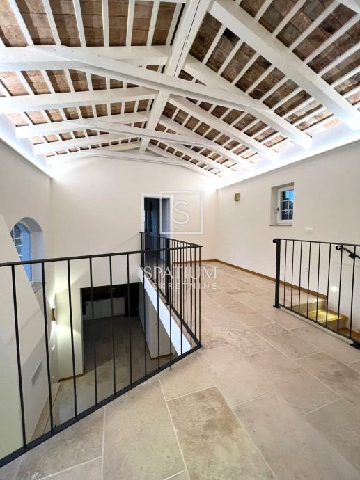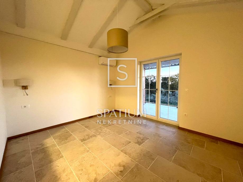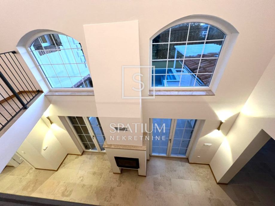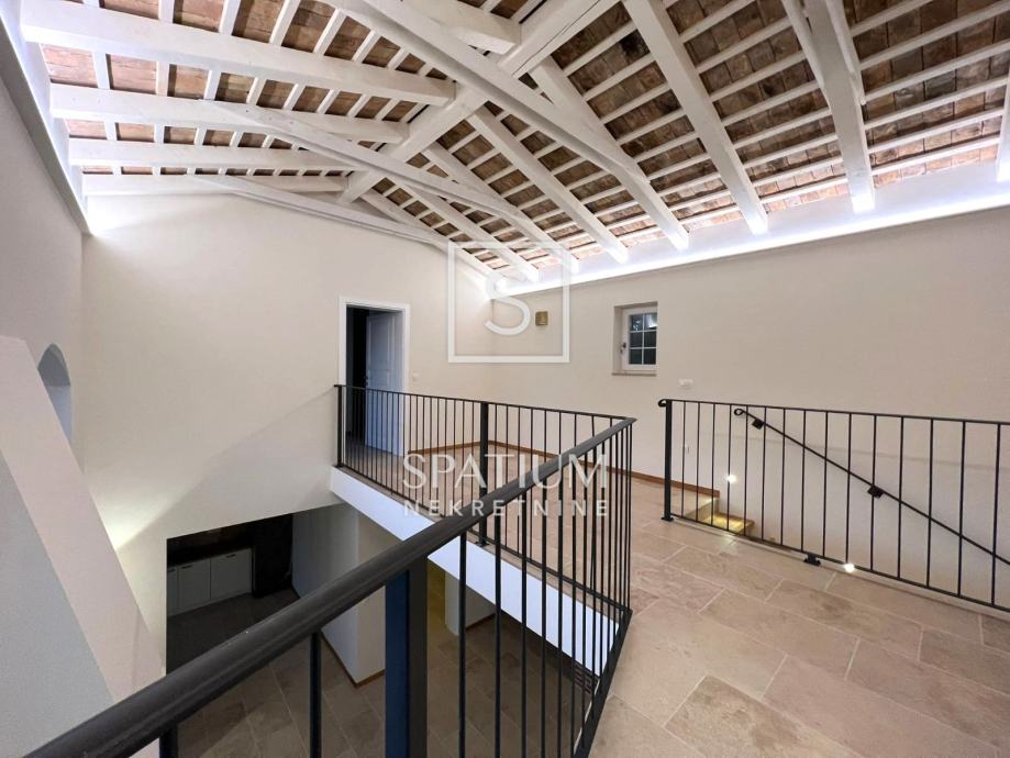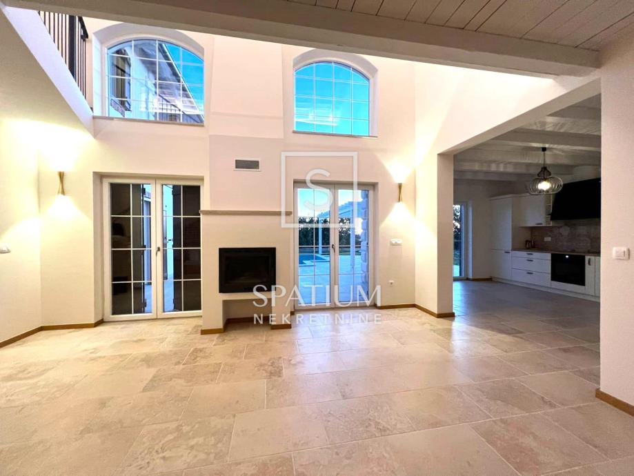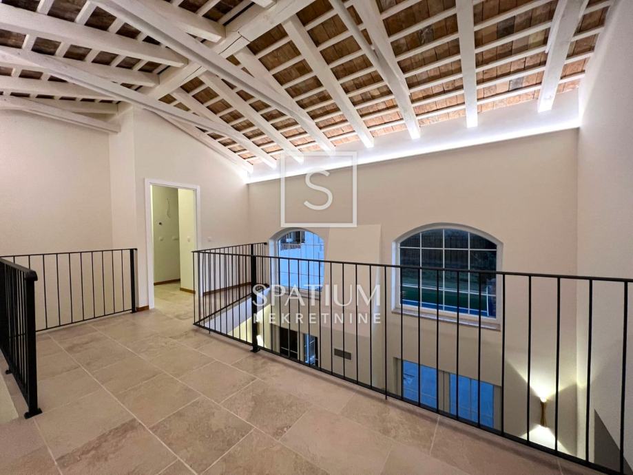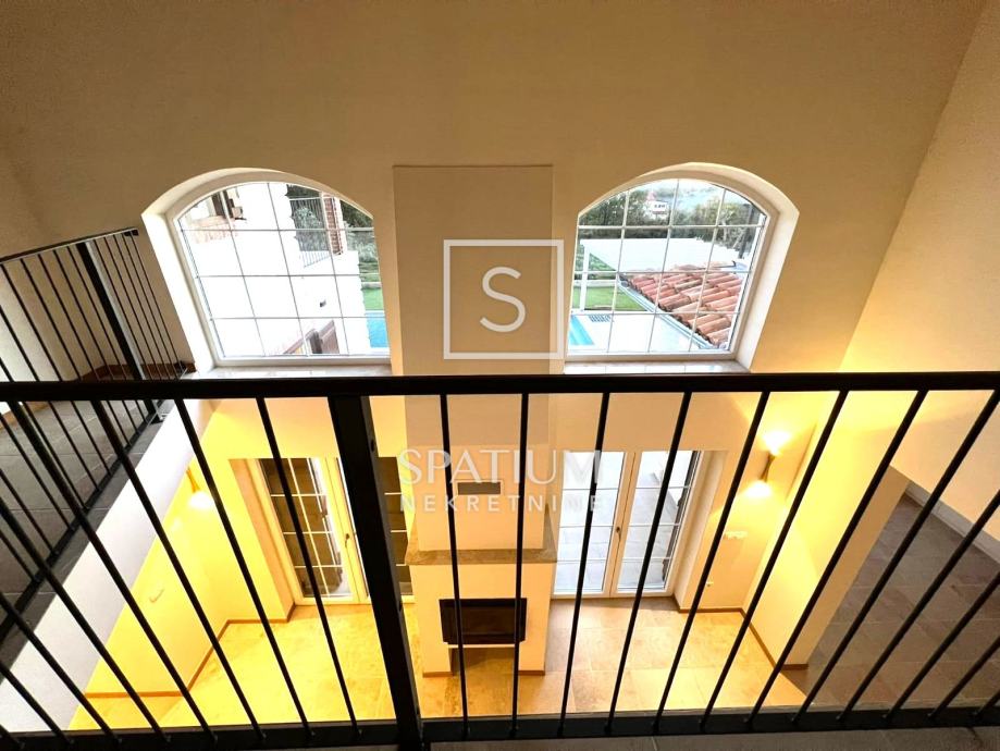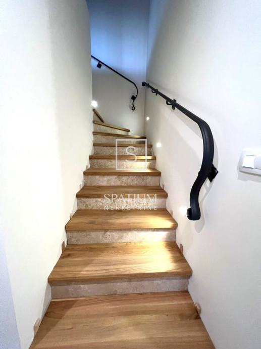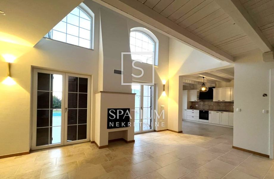 U prizemlju se nalazi prostrani dnevni boravak s kuhinjom i blagovaonom, toalet, tehnička soba te sauna i glavna spavaća soba s kupaonom. Sve su prostorije u prizemlju velikim staklenim vratima povezane s lijepom okućnicom. Unutarnjim stubištem dolazi se na galeriju. Otvoreno krovište koje se proteže i dvjema spavaćim sobama s kupaonama, izgleda zaista posebno. Svaka spavaća soba ima izlaz na terasu.