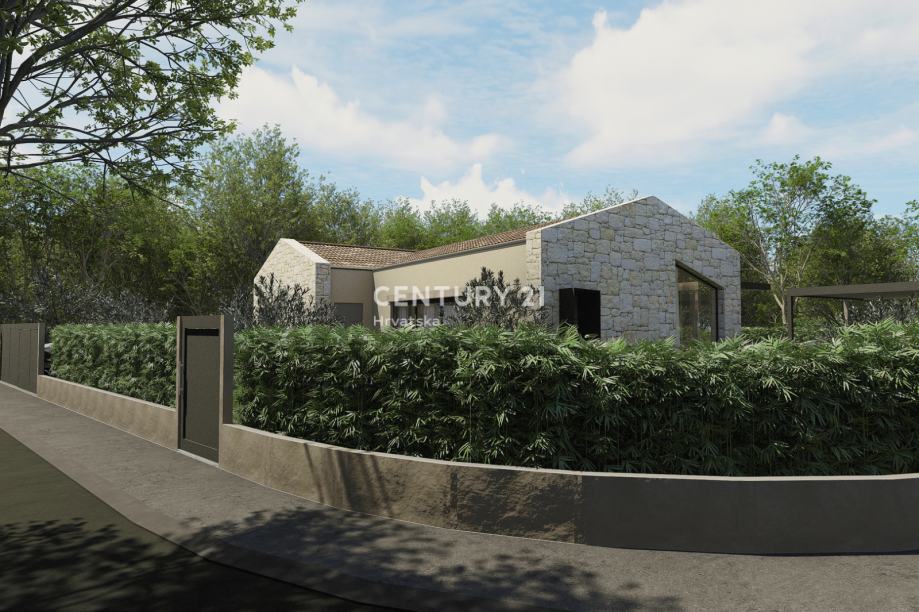 Na zemljištu je napravljen moderan i funkcionalan projekt za kuću prizemnicu od 140 m2 s bazenom.