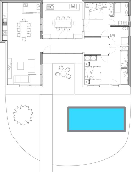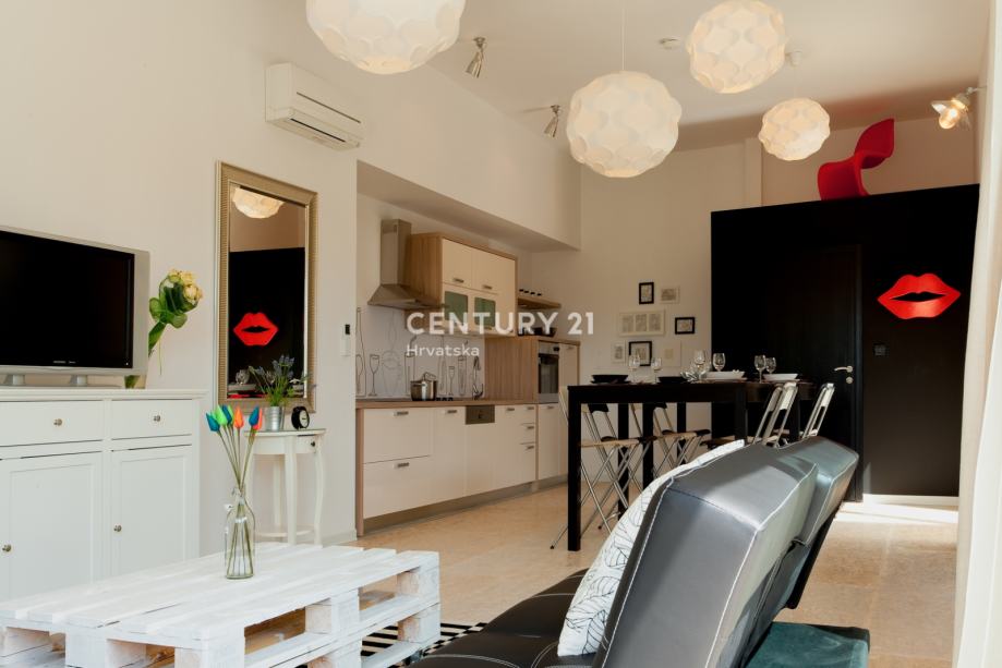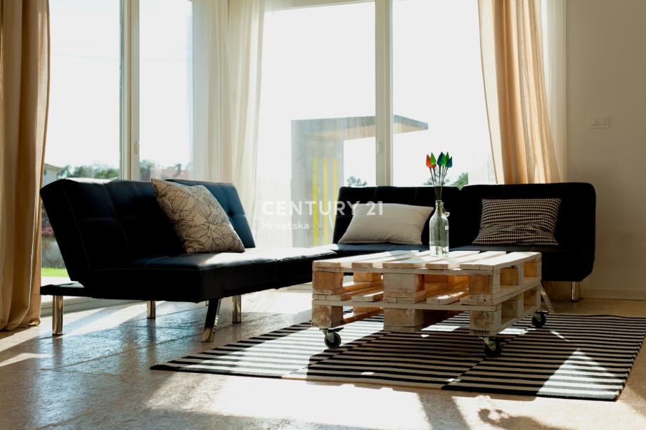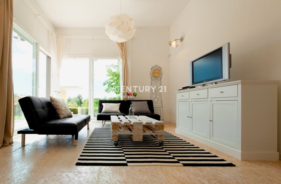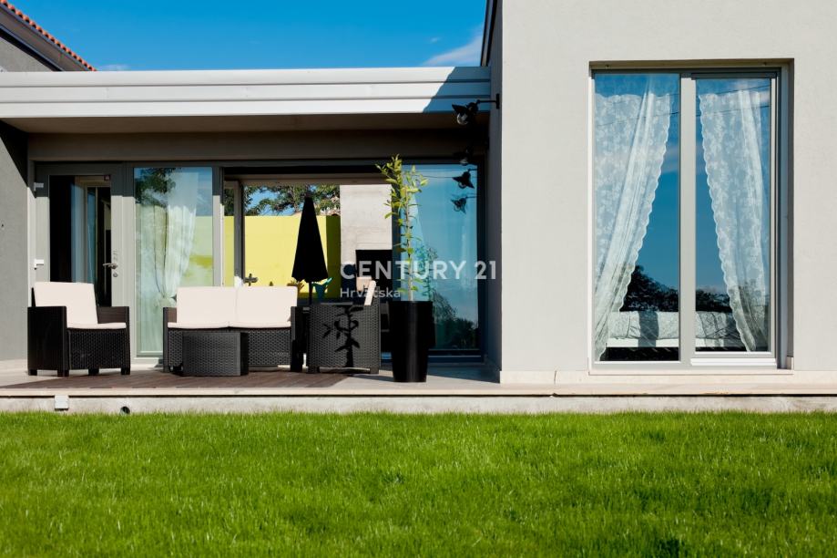Iz dnevnog boravka se izlazi na sunčalište s bazenom, savršeno mjesto za opuštanje i uživanje u toplim ljetnim danima.