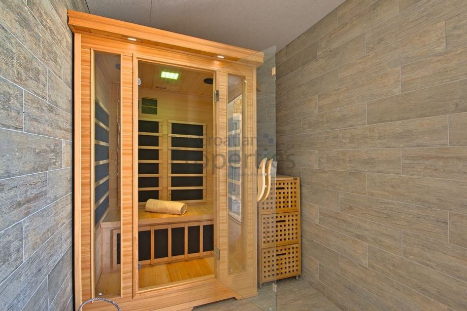 Vanjski dio kuće sastoji se od grijanog bazena, vanjskog jacuzzia, saune, dodatnog spremišta i natkrivene ljetne kuhinje.Grijanje u kući je putem klima uređaja.