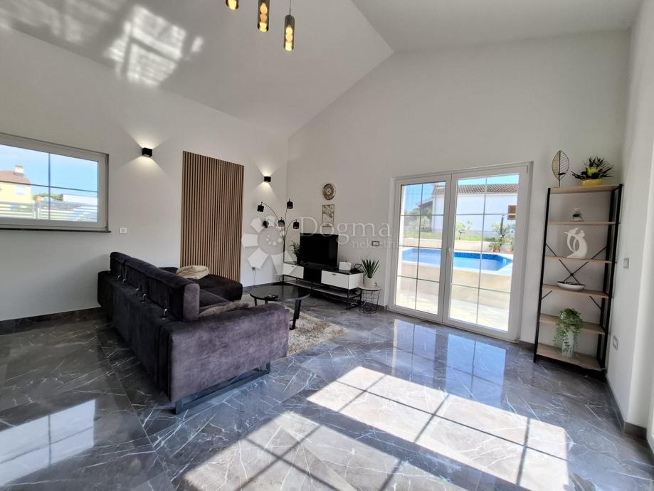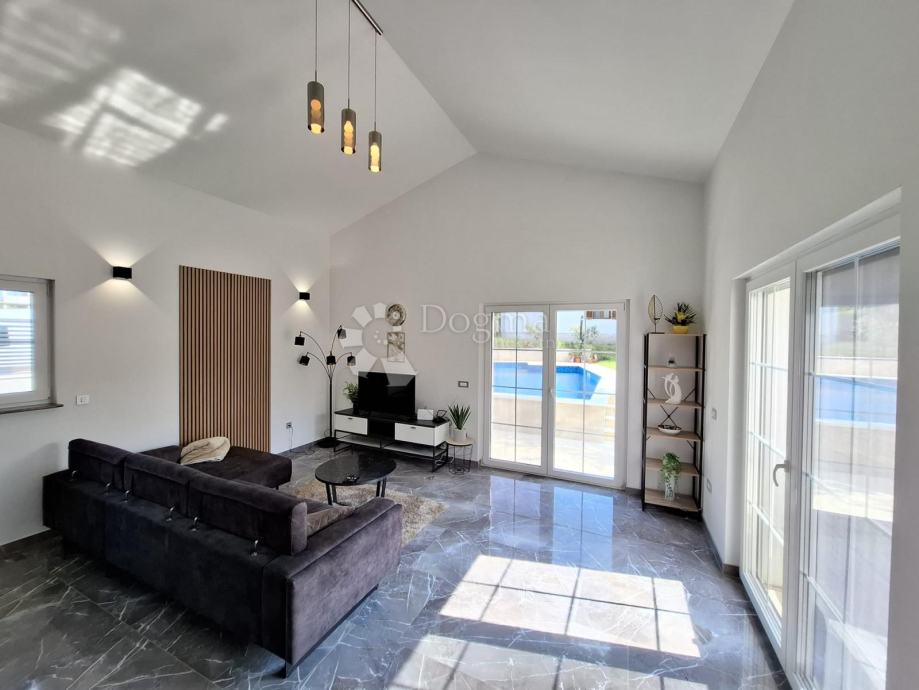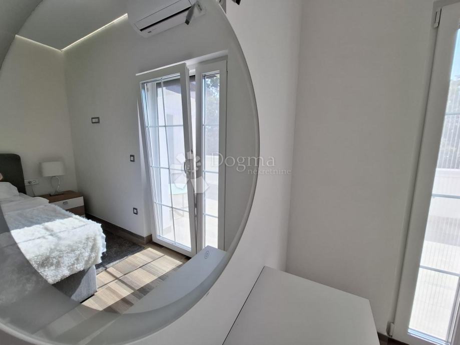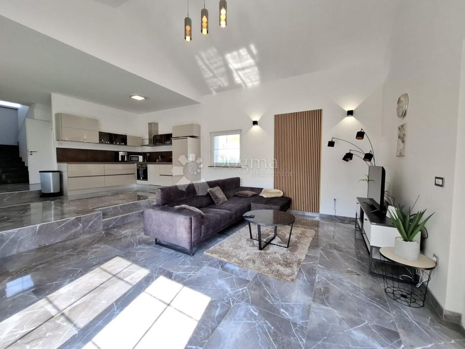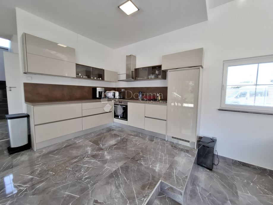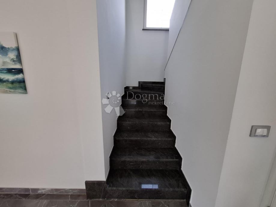 Prizemlje kuće sastoji se od ulaznog hodnika, prostranog dnevnog boravka, kuhinje, blagovaone, spavaće sobe sa kupaonom te wc-a za goste. Kroz cijeli dnevni prostor postavljene su staklene stijene koje prostoru omogućuju dotok sunčeve svijetlosti. Iz dnevnog prostora izlazi se na natkrivenu terasu gdje se smjestila ljetna kuhinja. Na prostranoj okućnici smjestio se bazen sa sunčalištem. Elegantnim stubištem dolazimo na drugu etažu kuće gdje se nalaze dvije prostrane spavaće sobe s vlastitim kupaonama i zajedničkom terasom.