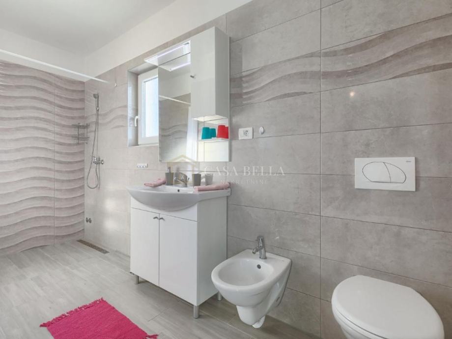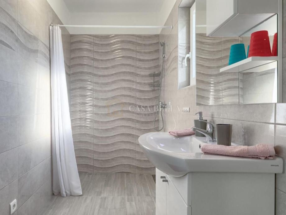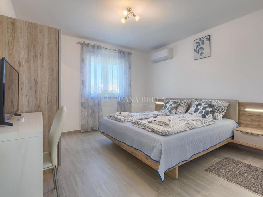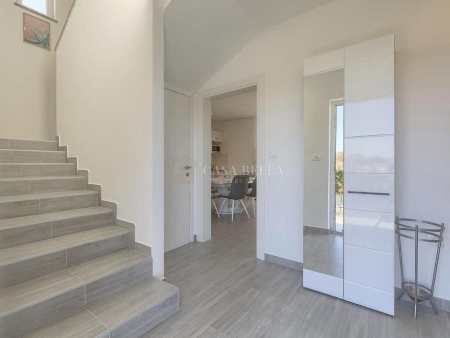 Na prizemlju vile se nalazi udoban dnevni boravak s kaminom, kao i potpuno opremljena kuhinja s prostorom za objedovanje. Na prizemlju ćete također pronaći jednu spavaću sobu i dvije kupaonice. Na gornjem katu se nalaze 2 spavaće sobe, svaka sa svojom kupaonicom kako bi Vaš boravak u vili bio što ugodniji. Vila je svjetla i prozračna .Sustav grijanja i hlađenja je putem inverter klima te kao dodatak u dnevnom boravku se nalazi kamin s imitacijom plamena .