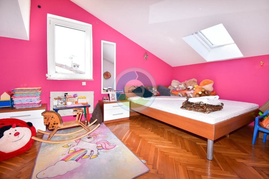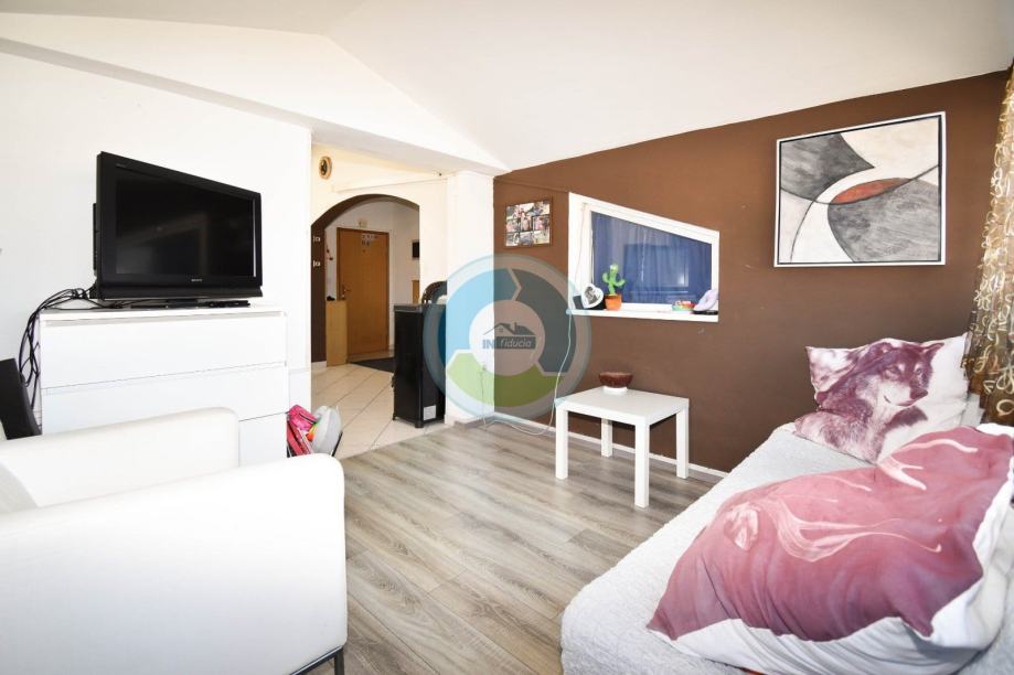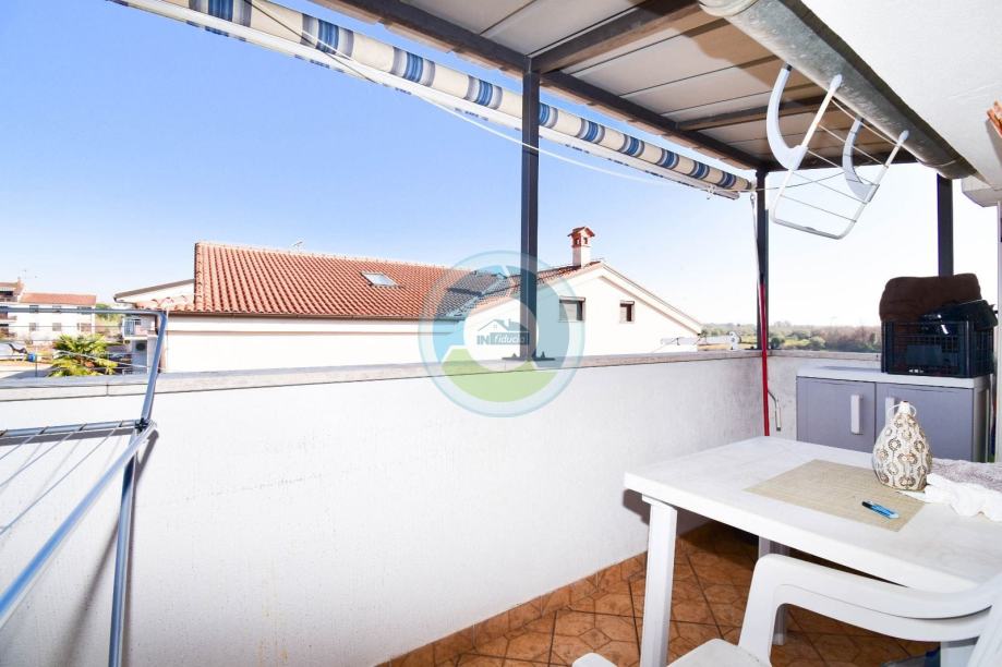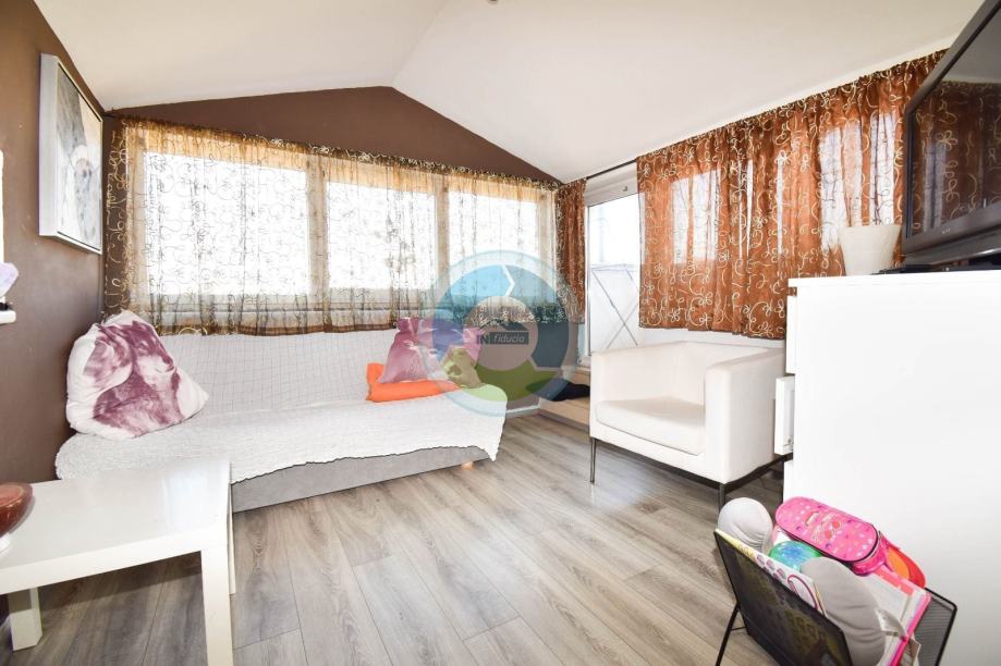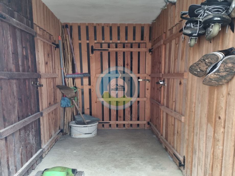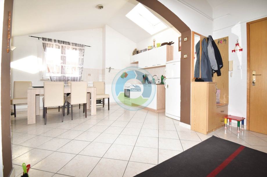 Stan se nalazi u visokom potkrovlju zgrade izgrađene 2000. godine. Sastoji se od ulaznog hodnika i dnevnog prostora (open space): kuhinje i blagovaone, zatim dnevnog boravka sa izlaskom na balkon (istočna strana). Stan ima dvije spavaće sobe, jednu manju i jednu veću, te kupaonu. Manja soba i kupaona imaju malo nakošene krovove. Iz veće sobe sa otvara pogled na more. Grijanje je regulirano putem peći na drva, no postoji još i klimatska jedinica te električne ploče (grijalice). Stan se prodaje kompletno sa namještajem i opremom. Stolarija je PVC. Pripada mu drvarnica u suterenu zgrade, i parkirno mjesto, dok stanari (ukupno 6 stanova) imaju na zajedničko korištenje vrta sa postavljenim kamenim stolom i kaminom (cca 50 m2) ispred zgrade. Lokacija je udaljena od mora 800 m, te je idealna za one koji žele biti u blizini uređenim plaža i idealnih šetnica, a opet u mirnom okruženju.