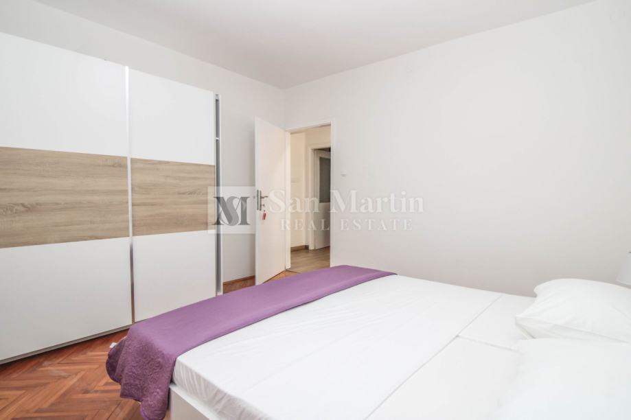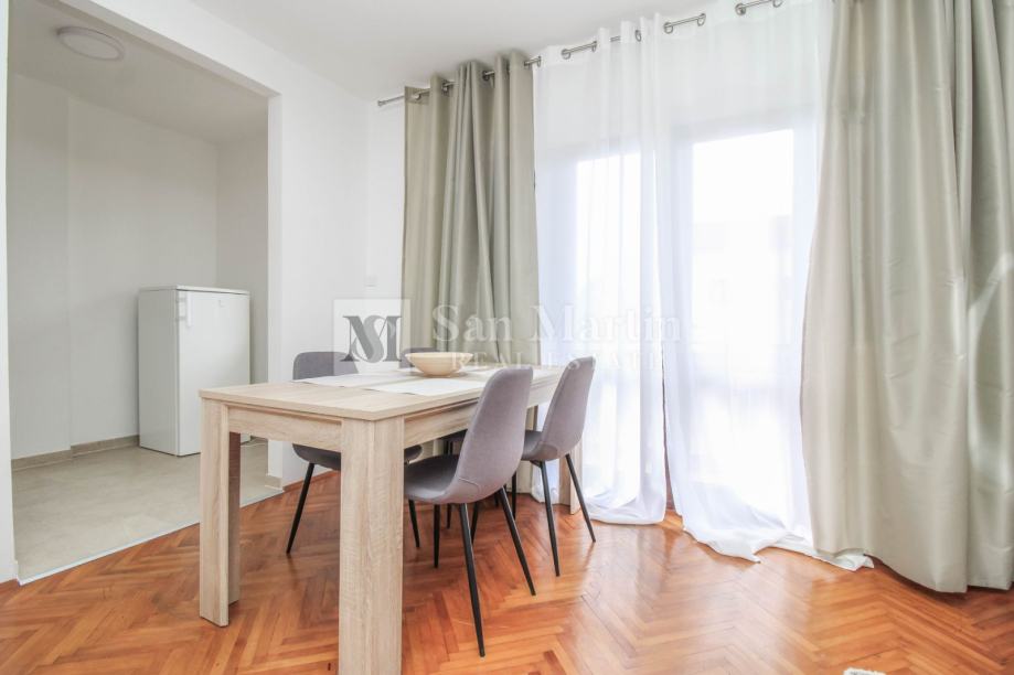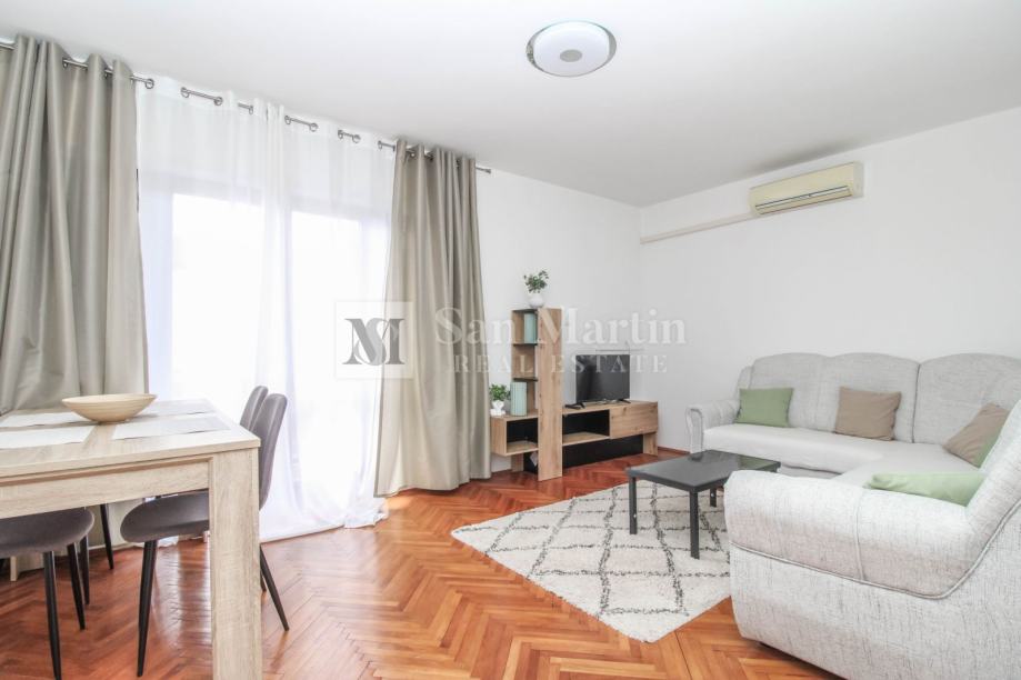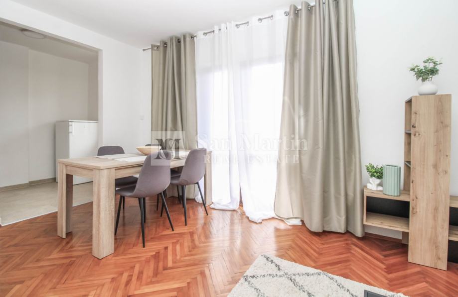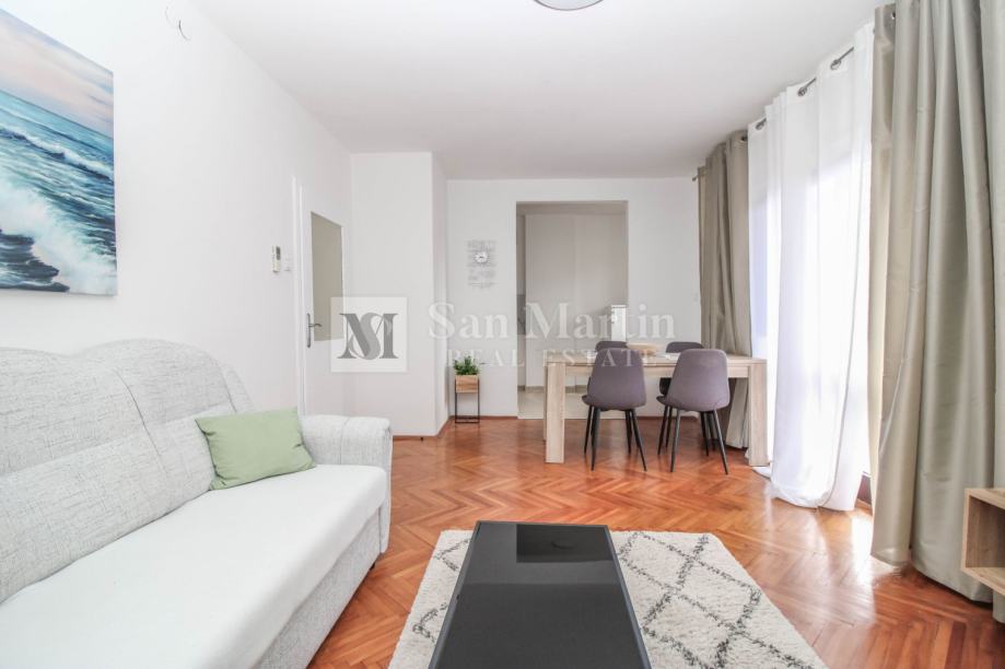 Na prodaju je lijepi prostrani stan ukupne površine 94 m2 koji se smjestio na prvom katu manje zgrade. Nekretnina se sastoji od ulaznog hodnika, dnevnog boravka, kuhinje, blagovaone, dvije spavaće sobe te kupaone.