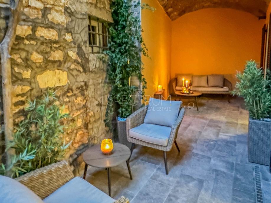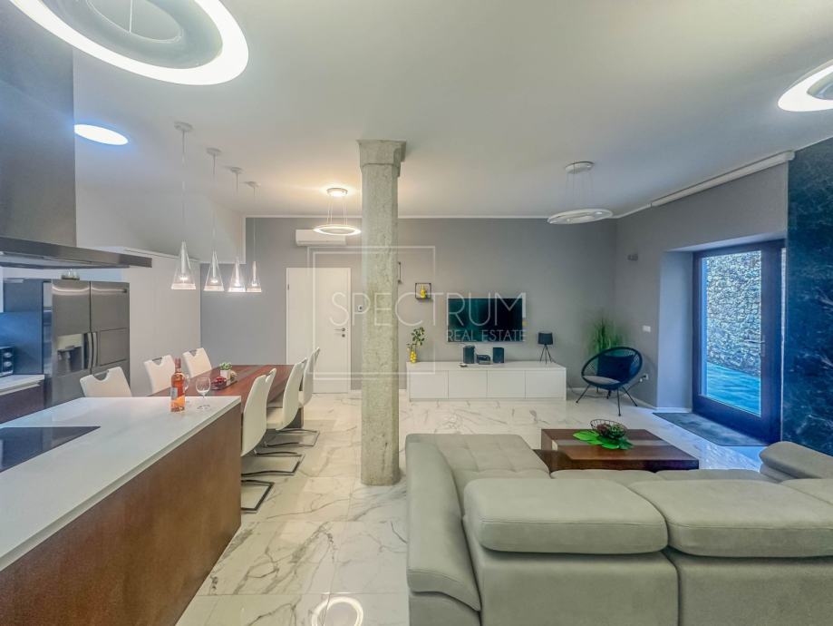 Stan se nalazi u prizemlju manje stambene zgrade sa 3 stambene jedinice. Površina stana iznosi 96.27 m2. Stan se sastoji od ulaznog hodnika, open space dnevnog boravka sa kuhinjom i blagovaonicom, 2 spavaće sobe, 2 kupaonice i praonice. Jedna spavaća soba ima vlastitu kupaonicu. Iz dnevnog boravka i iz jedne spavaće sobe se izlazi na natkrivenu terasu i dvorište, koji predstavljaju idealan prostor za uživanje na otvorenome. U dvorištu su postavljeni priključci vode za ljetnu kuhinju ili jacuzzi. Zbog svoje veće površine, stan zaista pruža komfor. Stan se grije putem podnog grijanja i klima uređaja. Stan je kompletno renoviran 2017.godine. U renovaciji su korišteni kvalitetni materijali i namještaj po mjeri. Kod renovacije je posvećena pažnja na očuvanje autohtonih detalja poput kamenih stupova kako bi se zadržao kulturno-povijesni šarm. Postavljen je i video parlafon. U kuhinji je postavljen i solar tube radi prirodnog osvjetljenja. Stan se prodaje namješten.