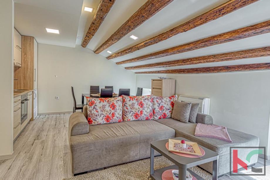 Prodaje se stan veličine 48 m2 smješten u Poreču, u potkrovlju zgrade s tri kata. Ovaj šarmantni 1,5-sobni stan pruža nesvakidašnji pogled na more, smješten u prvom redu do mora, što ga čini idealnim izborom za one koji žele na vlastitoj terasi uživati u pogledu na more i zalazak sunca.