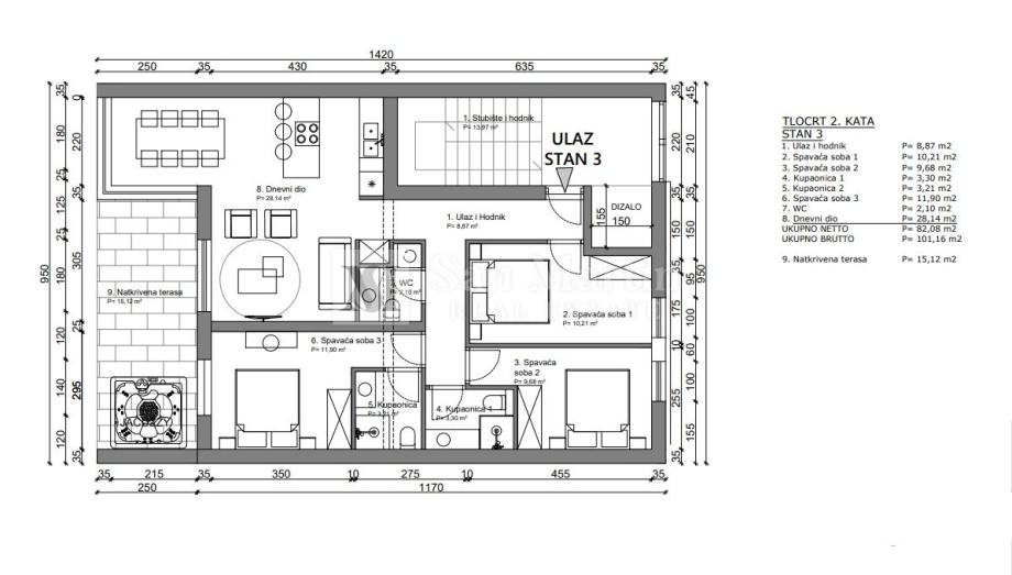 Stan se sastoji od hodnika, kuhinje, blagovaonice i dnevnog boravka otvorenog tipa s izlazom na prostranu natkrivenu terasu s pogledom na more, te tri spavaće sobe, dvije kupaonice te WC-om za goste.