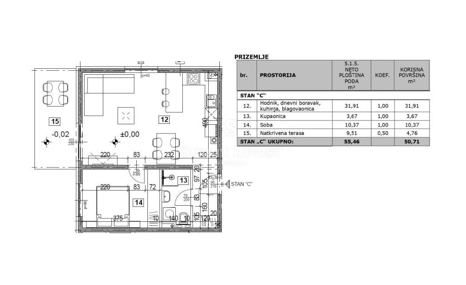 STAN C – neto korisne površine 50.71 m2 s pripadajućim vrtom of 34 m2 smješten je u prizemlju zgrade te sastoji se od hodnika, dnevnog boravka s kuhinjom i blagovaonicom, spavaće sobe, kupaonice, te natkrivene terase od 9.51 m2 (koef. 0.5=4.76 m2). Stanu također pripada vrt površine 34 m2, spremište površine 1.74 m2 te parkirno mjesto od 12.48 m2.