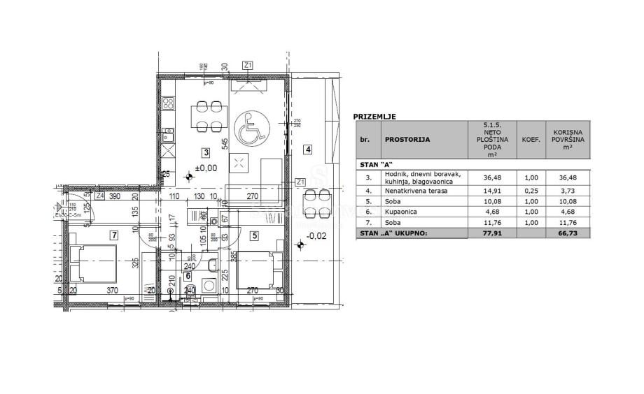 STAN A – neto korisne površine 66.73 m2 s pripadajućim vrtom of 206.70 m2 smješten je u prizemlju zgrade te priladođen potrebama osoba s ograničenom mobilnošću. Sastoji se od dnevnog boravka s kuhinjom i blagovaonicom, 2 spavaće sobe, kupaonice, te nenatkrivene terase od 14.91 m2 (koef. 0.25=3,73 m2). Stanu također pripada vrt površine 206.70 m2, spremište površine 2.3 m2 te parkirno mjesto od 12.48 m2, što sve čini ukupnu površinu stana i pripadaka od 91.67 m2.