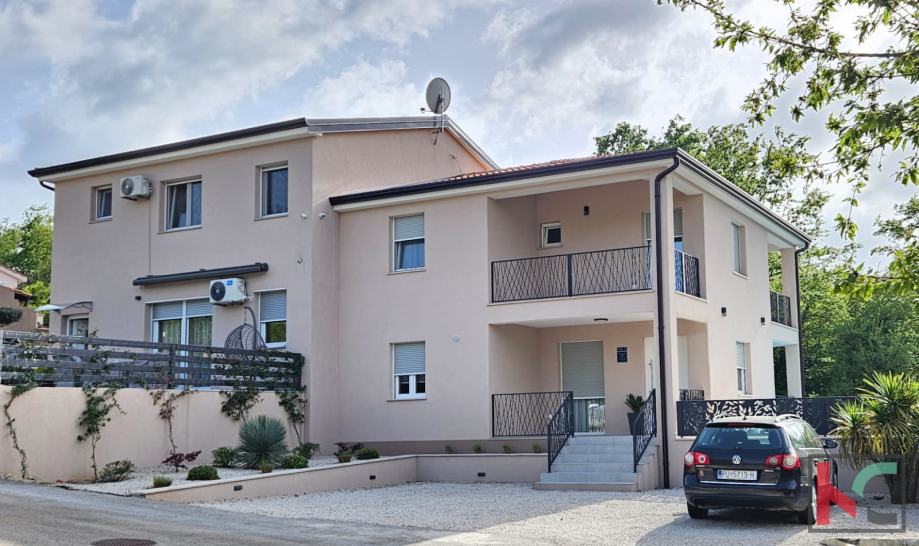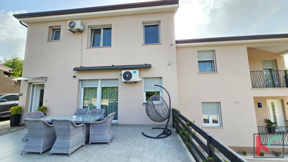 Jedna kuća ima odvojena tri stana, od kojih dolnji stan ima 80 m2, te dva stana na drugom katu svaki od 40m2. Oko kuće je uredna i održavana okućnica te natkrivena parkirna mjesta sa vrtnom kućicom i mjestom za odlaganje stvari.