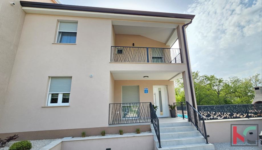 Iz spavaće sobe u prizemlju imamo i izlaz direktno na balkon, a iz dnevnog boravka na bazen i sunčalište koji pruža mir i tišinu sa pogledom na prirodu.Unutarnjim stubištem dolazimo na prvi kat gdje se nalaze tri komotne spavaće sobe svaka sa vlastitom kupaonom i balkonom.