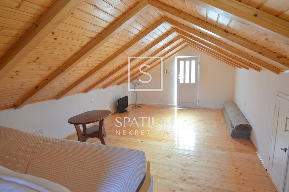 Kuća se sastoji od kuhinje s blagovaonicom i dnevnim boravkom, spavaće sobe, dvije kupaonice te dodatne prostorije na katu do koje se dolazi vanjskim stepenicama. U dnevnom boravku nalazi se kamin, koji pruža ugodnu atmosferu tijekom cijele godine. Nekretnina se prodaje potpuno namještena i odmah je useljiva.