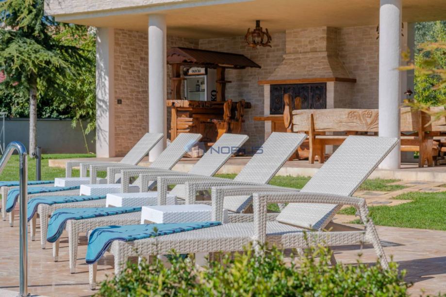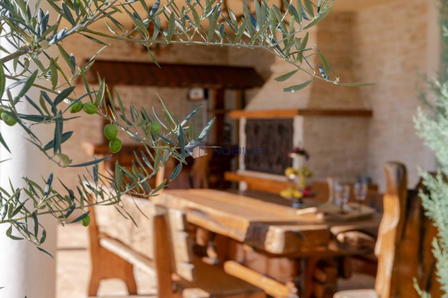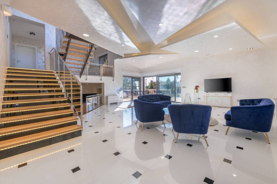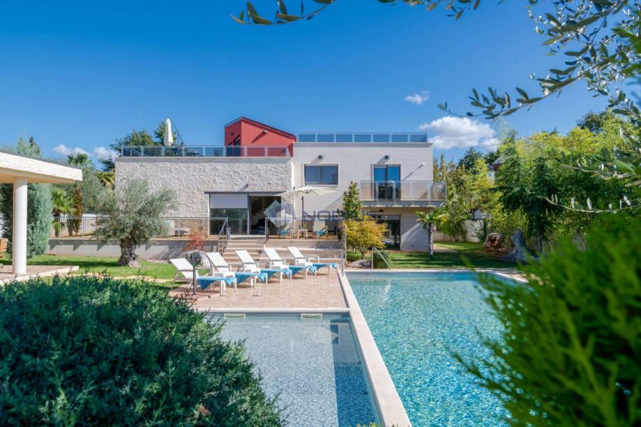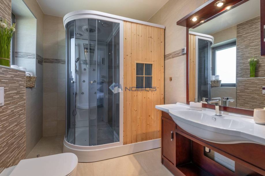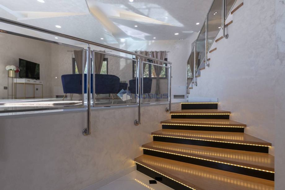 Kuća je veličine cca.350 četvornih metara na 2 etaže na parceli od 1400 m2 te se sastoji od 4 spavaćih soba, 5 kupaonice, s nizom terasa za sunčanje i hladovinom, dviju sauna velikim bazenom za kupanje te manjim namijenjen za djecu, velikom vanjskom sjenicom sa kuhinjom i roštiljem.