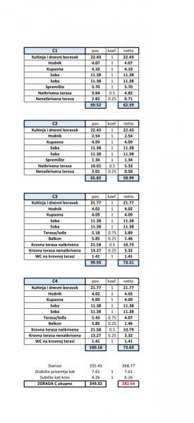 Po tipu su dvosobni stanovi od 62 m2 i 66 m2.. svaki stan u prizemlju ima dio zemljišta u vlasništvu ,cca od 40 m2 do 150 m2 , što če biti definirano na kraju izgradnje zgrade.