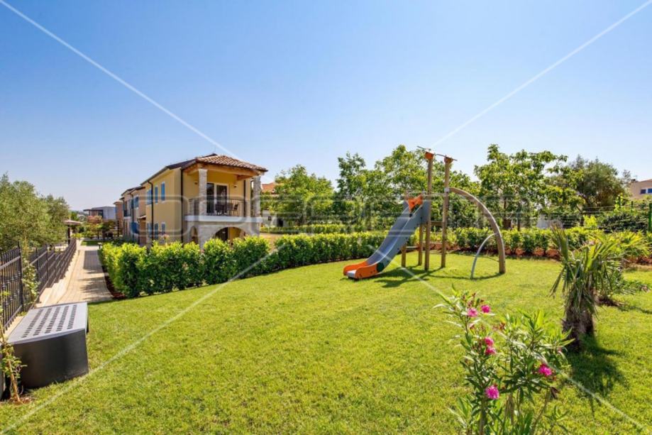 Kompleks je okružen prekrasnim mediteranskim vrtom. Vanjski prostor također se može pohvaliti prostranim bazenom od 60 m2, jacuzzijem, terasom za sunčanje s ležaljkama i dječjim igralištem.