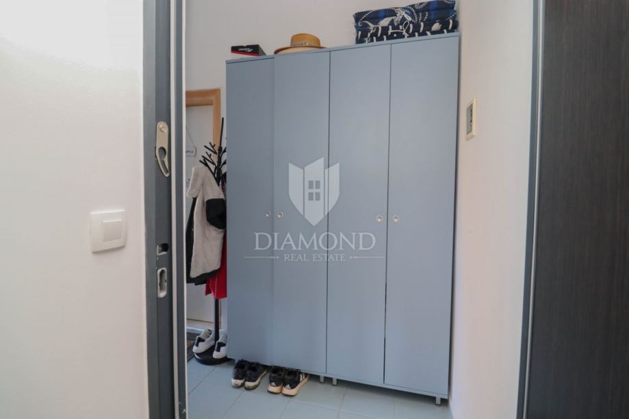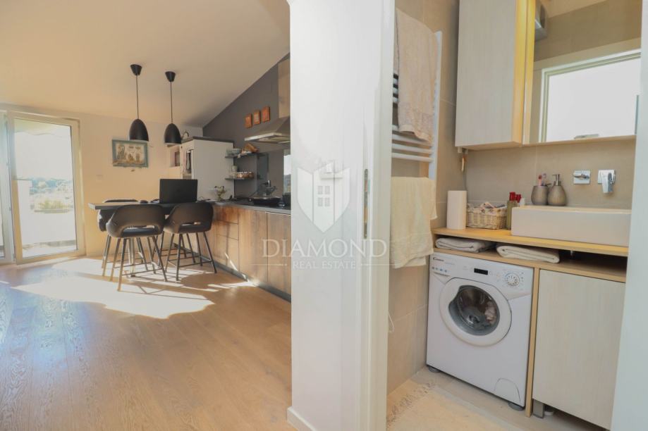 Unutrašnjost odiše elegancijom i promišljenim detaljima: prostrana spavaća soba s pogledom na vrt, svijetao dnevni boravak povezan s kuhinjom i izlazom na terasu, te moderna kupaonica opremljena vrhunskim materijalima. Cijeli prostor je potpuno opremljen namještajem rađenim po mjeri i uređen prema najvišim standardima, budući da je stan korišten isključivo za privatne potrebe i nikada nije bio iznajmljivan.