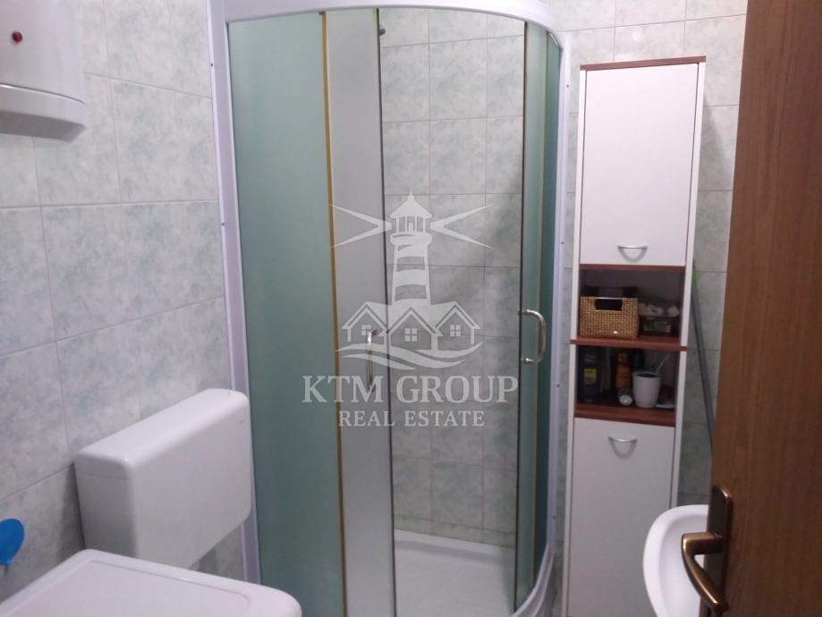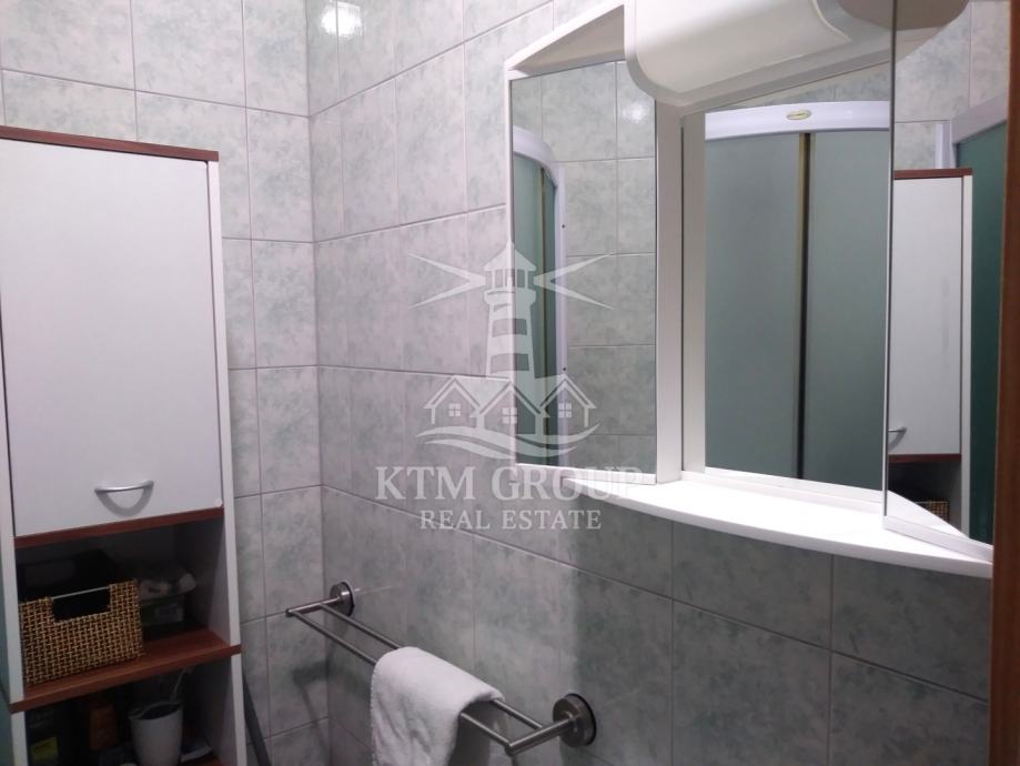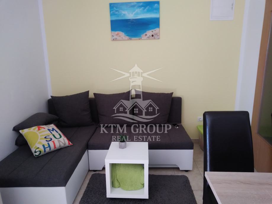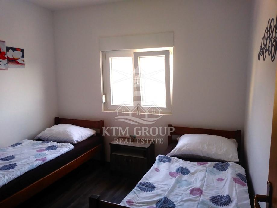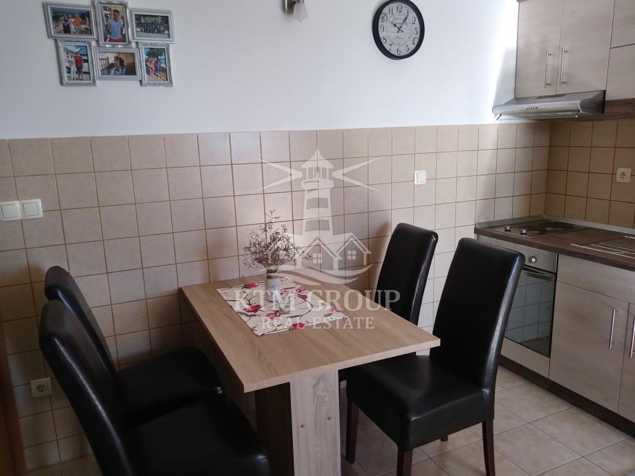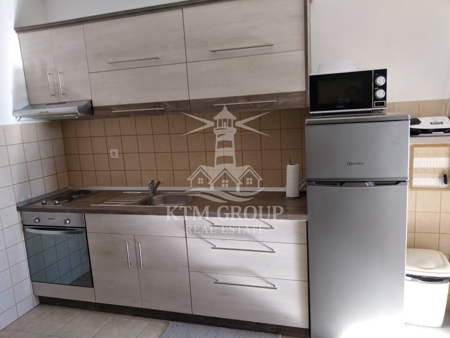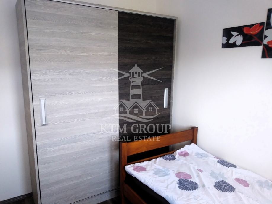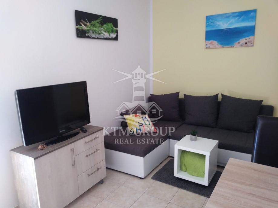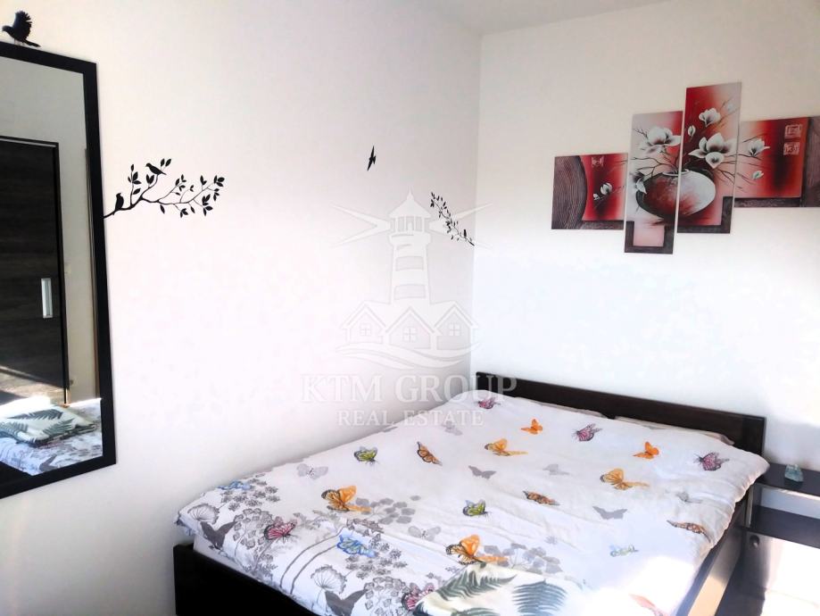 Apartman se sastoji se od ulaznog hodnika, kuhinje s blagovaonicom i dnevnim boravkom, kupaonice s tuš kabinom, te dvije spavaće sobe. Iz dnevnog boravka postoji pristup terasi koja je osunčana veći dio dana. Prostor je uređen moderno te je useljiv odmah bez dodatnih ulaganja obzirom da se prodaje kompletno namješten. Postavljena je pvc stolarija i klima uređaj.