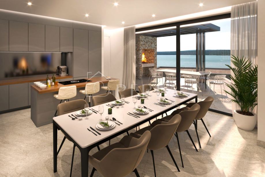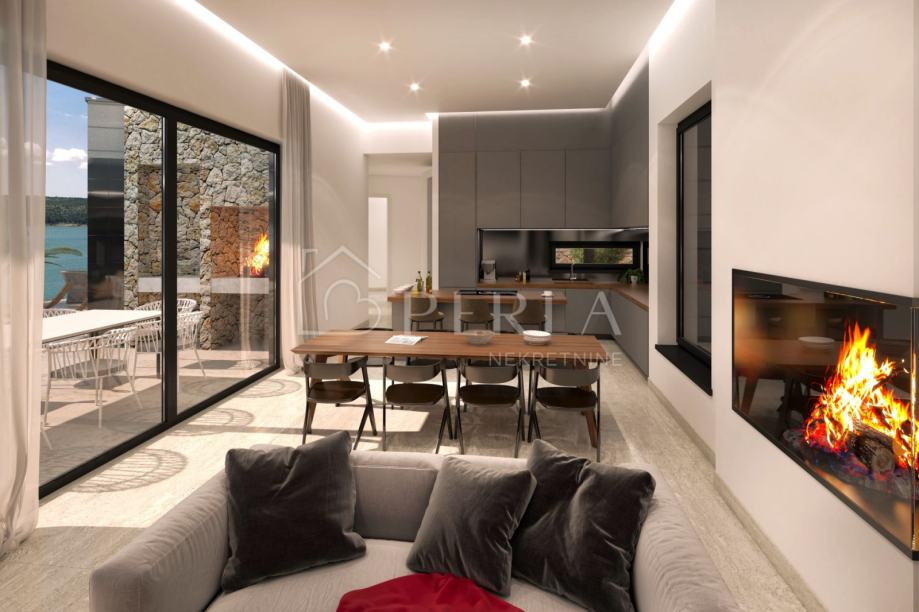 Nadalje nas uvodi u prostrani open space koncept dnevnog boravka sa kuhinjom i blagovaonicom koje su velikim prostranim podizno kliznim staklenim stijenama u punoj visini objekta vizualno povezani sa vanjskim prostorom tako da se iz cjelokupnog dnevnog prostora pruža spektakularan pogled na more.
