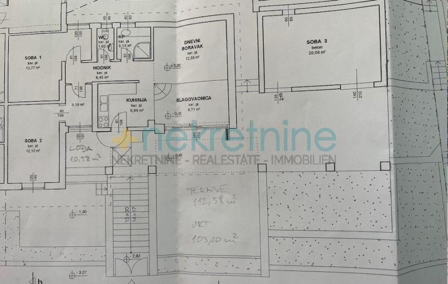 Predmet prodaje je etažno vlasništvo površine 120 m2, koji se sastoji od dvije spavaće sobe, open space dnevnog boravka sa kuhinjom i izlazom na veliku prostranu terasu i vrt, kupaone, wc-a, garaže u suterenu objekta, te velike ostave.