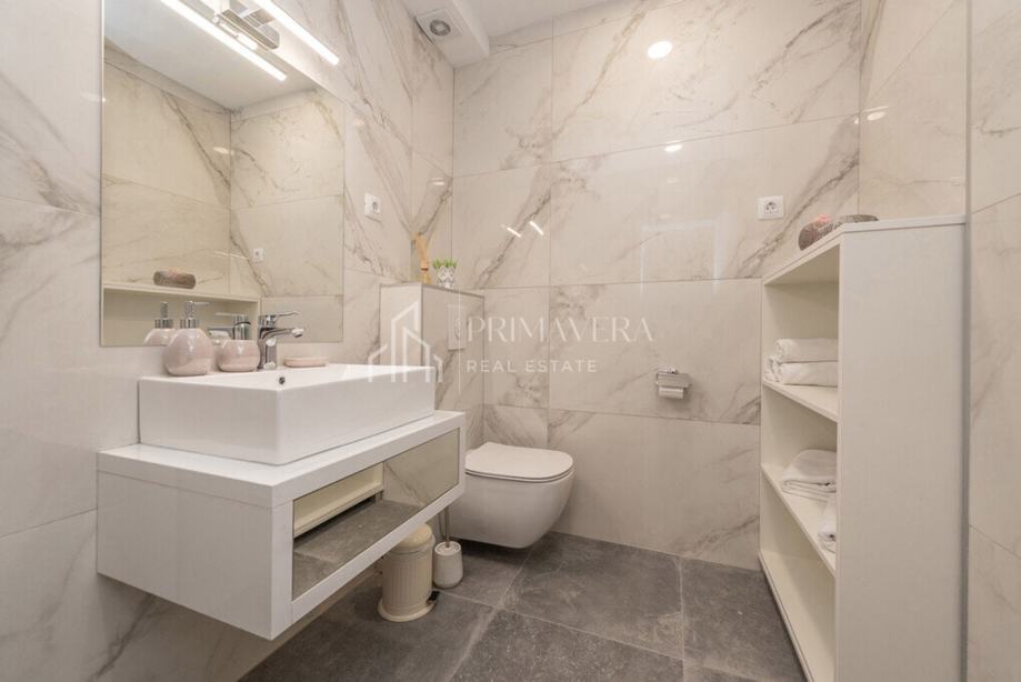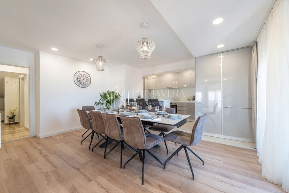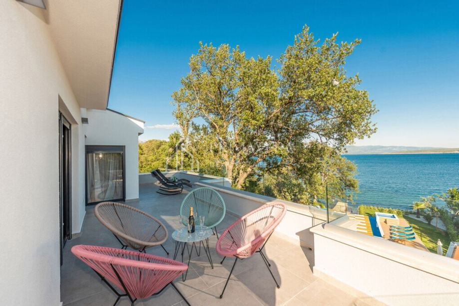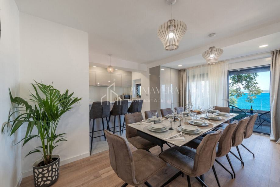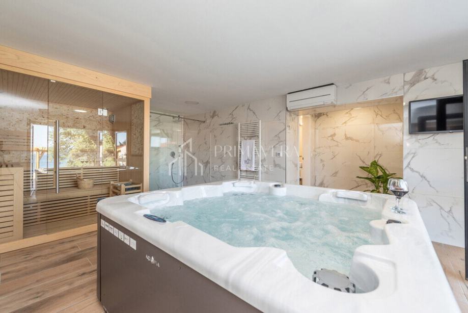 Na prvom je katu veliki otvoreni prostor kuhinje povezane s blagovaonicom i dnevnim boravkom, sa velikim staklenim stijenama što nudi prekrasan pogled na dvorište i otvoreni pogled na more. Na istoj etaži smještene su i dvije spavaće sobe. Na katu su preostale spavaće sobe s kupaonicama. Svaka je prostorija opremljena inverter klimom, a u dnevnom je boravku ostakljeni kamin za ljepši ugođaj zimi. Wellness/fitness prostor koji se nalazi u prizemlju kuće, sadrži i saunu i jacuzzi iz kojeg se pruža pogled na vanjski bazen i more.