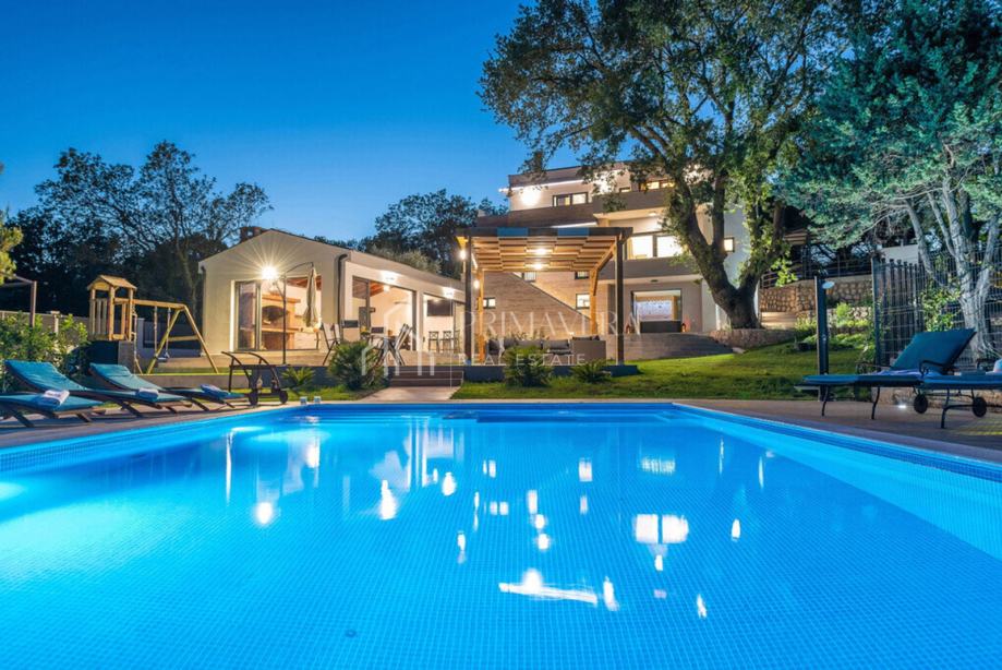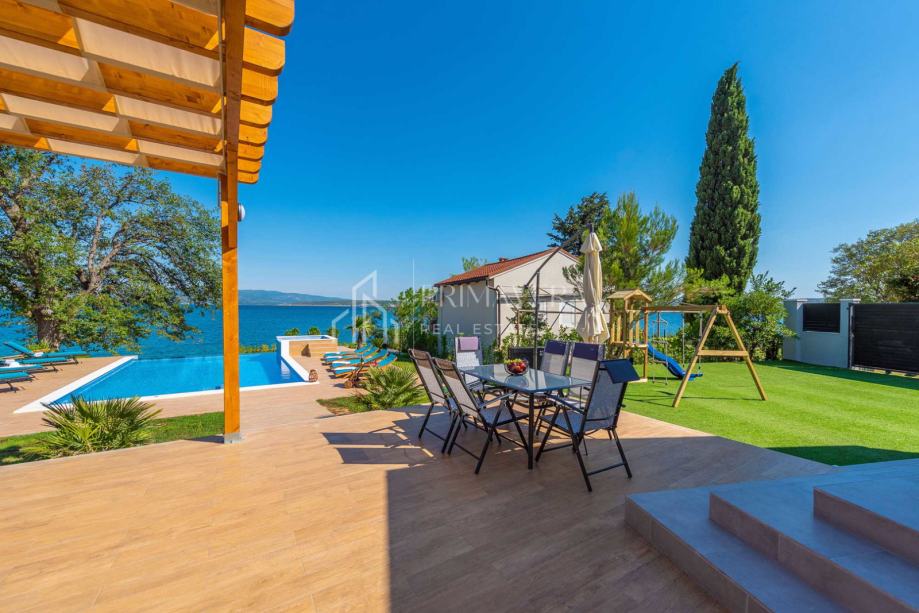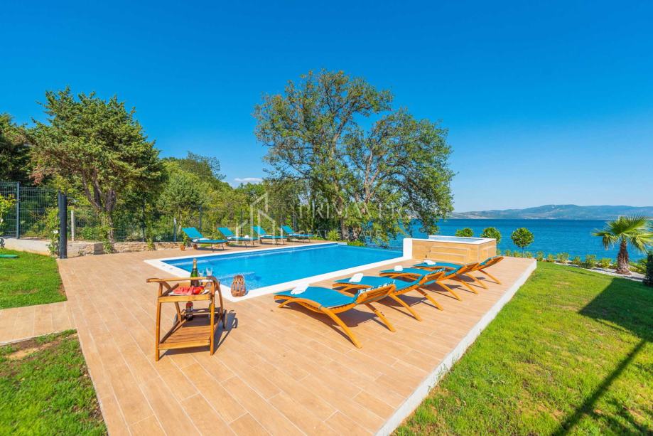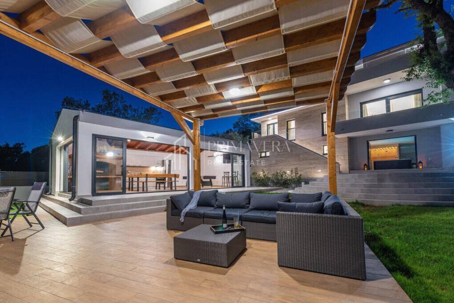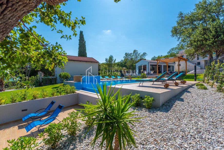 U dvorištu vile, uz bazen i verandu gdje se nalazi vanjski stol, smještena je ljetna kuhinja s velikim staklenim kliznim stijenama te ima namjenu zatvorenog prostora zimi, a poluotvorenog za toplije vrijeme. U njoj je osim kuhinje smješten i veliki komin te biljar i pikado za opuštanje i zabavu. Uz ljetnu kuhinju se nalazi i dječje igralište s toboganom i ljuljačkom. U sredini velikog dvorišta ove vile smješten je infinity bazen koji ima i funkciju grijanja, dok se na kraju lijepo uređenog vrta i okućnice nalazi privatna šljunčana plaža i more.