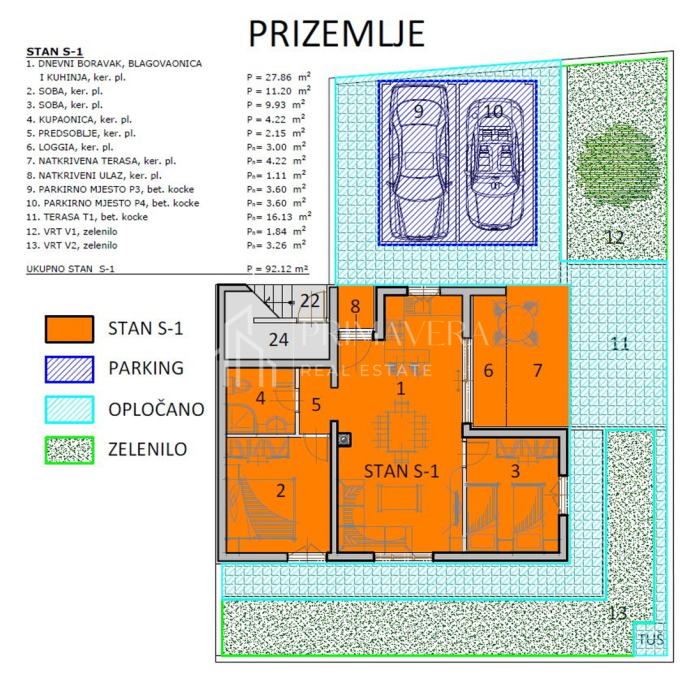 Posedarje, prodaje se stan u novoizgrađenom stambenom objektu sa dvije stambene jedinice. Stan oznake S1 na prizemlju objekta, ukupne površine 92,12 m2, sastoji se od dnevnog boravka sa blagovaonicom i kuhinjom, dvije spavaće sobe, kupaonice, predsoblja te natkrivene terase. Pripada mu dodatno i vlastito dvorište sa vanjskom terasom, vrtom, solarnim tušem i prilazom sa dva parkirna mjesta. Iz stana se pruža i pogled na more i Velebit!