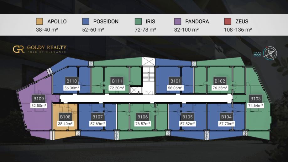 U prodaji je ukupno 88 stanova, od kojih su 5 tipskih stanova (Zeus, Pandora, Iris, Poseidon i Apollo).