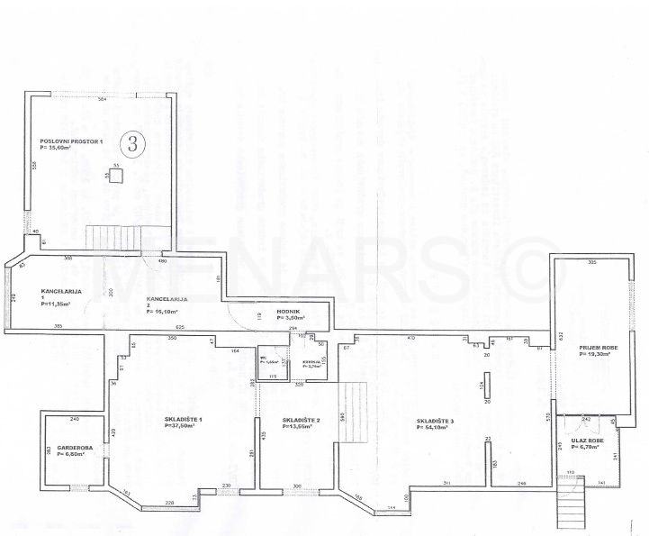 Prostor se sastoji od ulaznog dijela/prijema (6,70 m2), prostorije 1 (19,30 m2), prostorije 2 (54,10 m2), prostorije 3 (13,55 m2), wc-a, kuhinje, prostorije 4 (37,50 m2), garderobe, hodnika, 2 kancelarije ( 11,35 m2 i 16,10 m2), prostorije 5 (35,60 m2) - tlocrt među slikama.