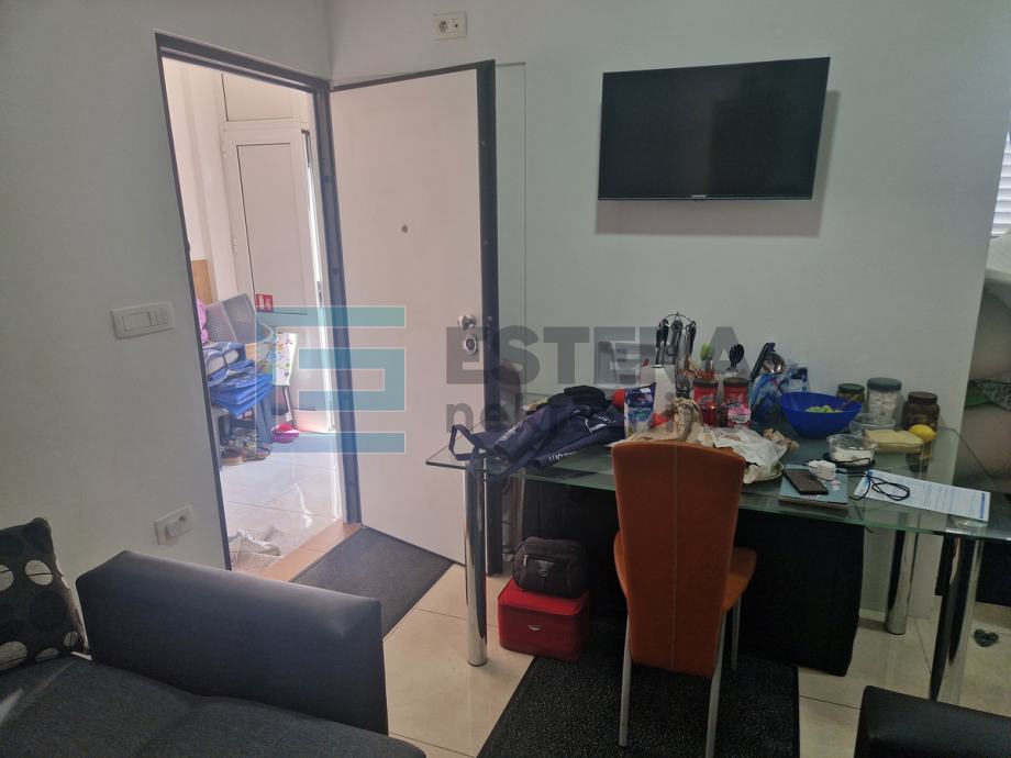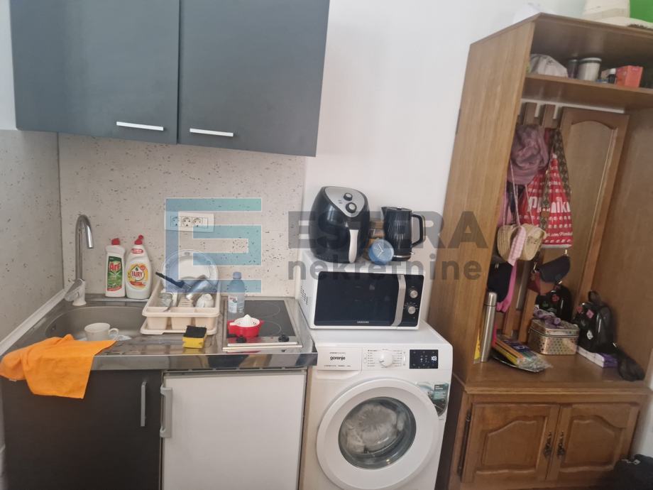 Nalazi se u prizemlju zgrade koji ima zajednički ulaz, a sastoji se od jedne sobe i kupaonice. Trenutno je namješten s dva trosjeda na razvlačenje, ormarom, blok kuhinjom, veš mašinom, klima uređajem i internetom. Visina prostora je 3,70m.