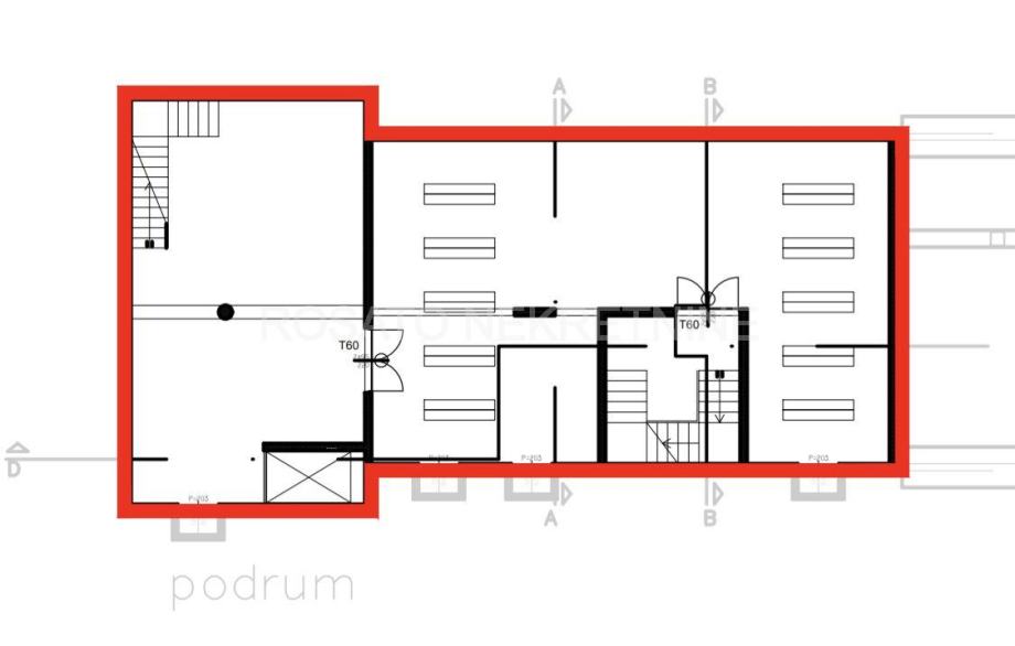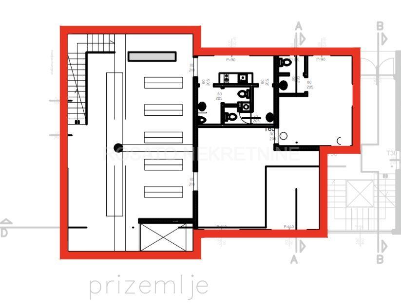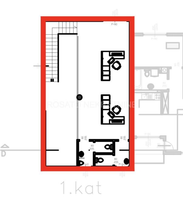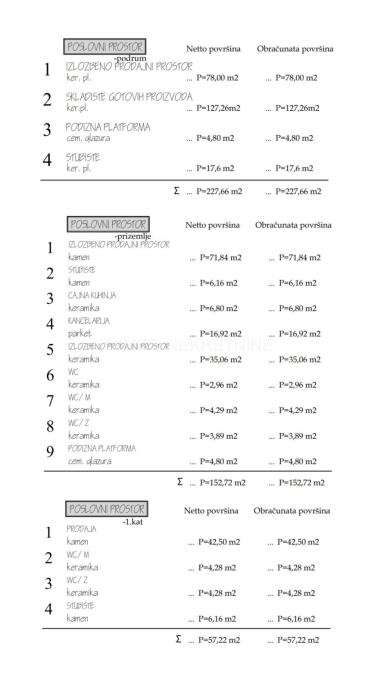 Prostor je ukupne bruto površine 437,60 m2, od čega je prizemlje 152,72 m2, podrum 227,66 m2 te prvi kat 57,22 m2. Ukupna obračunska neto površina iznosi 370,46 koja uključuje i 5 vanjskih parkirnih mjesta.