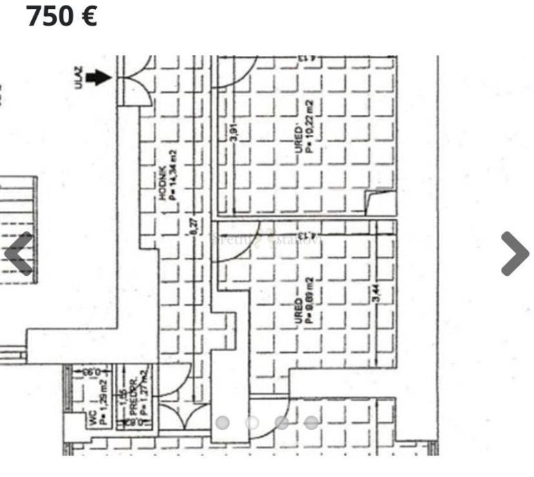 Ured se nalazi u centru Rijeke, blizu svih sadržaja potrebnih za besprijekorno i brzo obavljanje posla. Nalazi se u zgradi starije izgradnje ali dobro održavane, na 3. katu bez lifta, sjeverozapadne orijentacije. Grijanje je na klimu. Na katu se nalazi zajednički sanitarni čvor. Cijena mjesečnog najma je 750€ + PDV.
